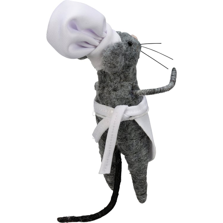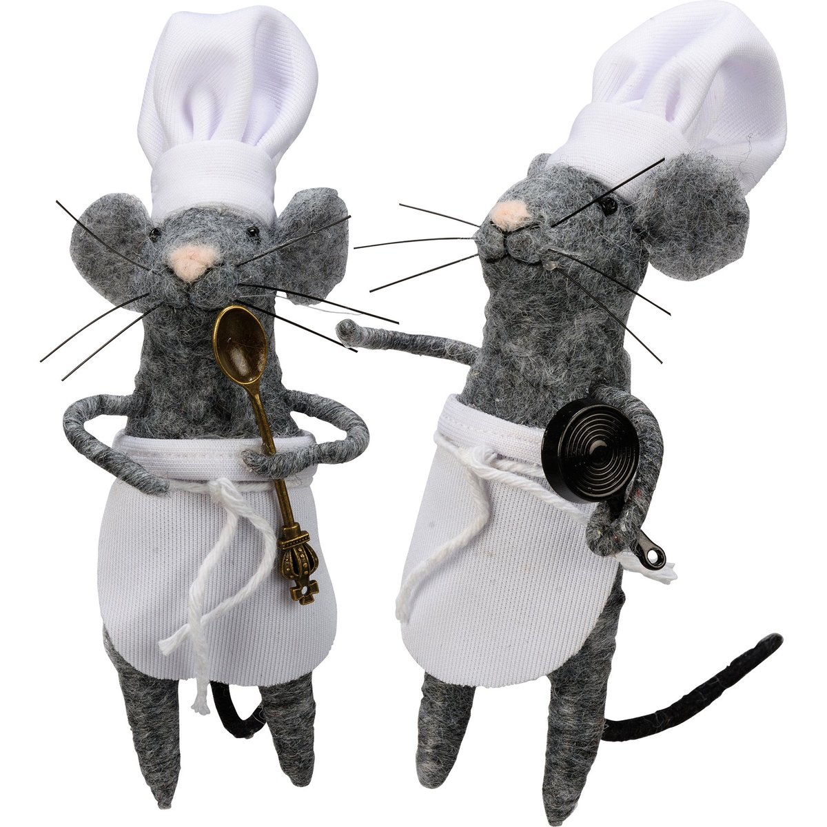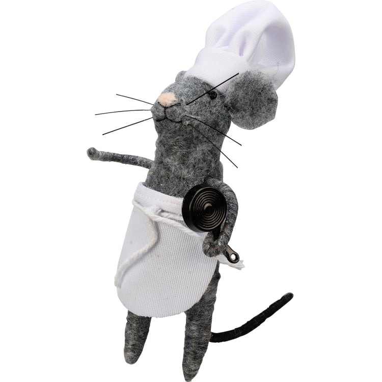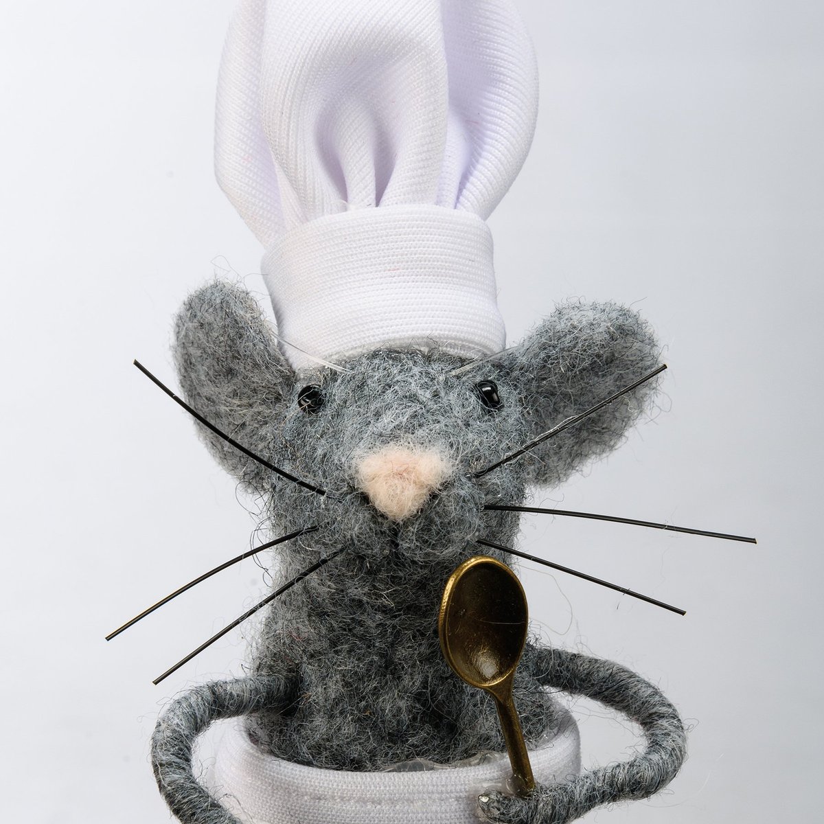 A set of two felt critter mice from our Kitchen Collection wearing chef hats and aprons. One is holding a frying pan and the other is holding a large spoon. Our Kitchen Mice critter set makes a great addition to any kitchen décor. This is not a toy.