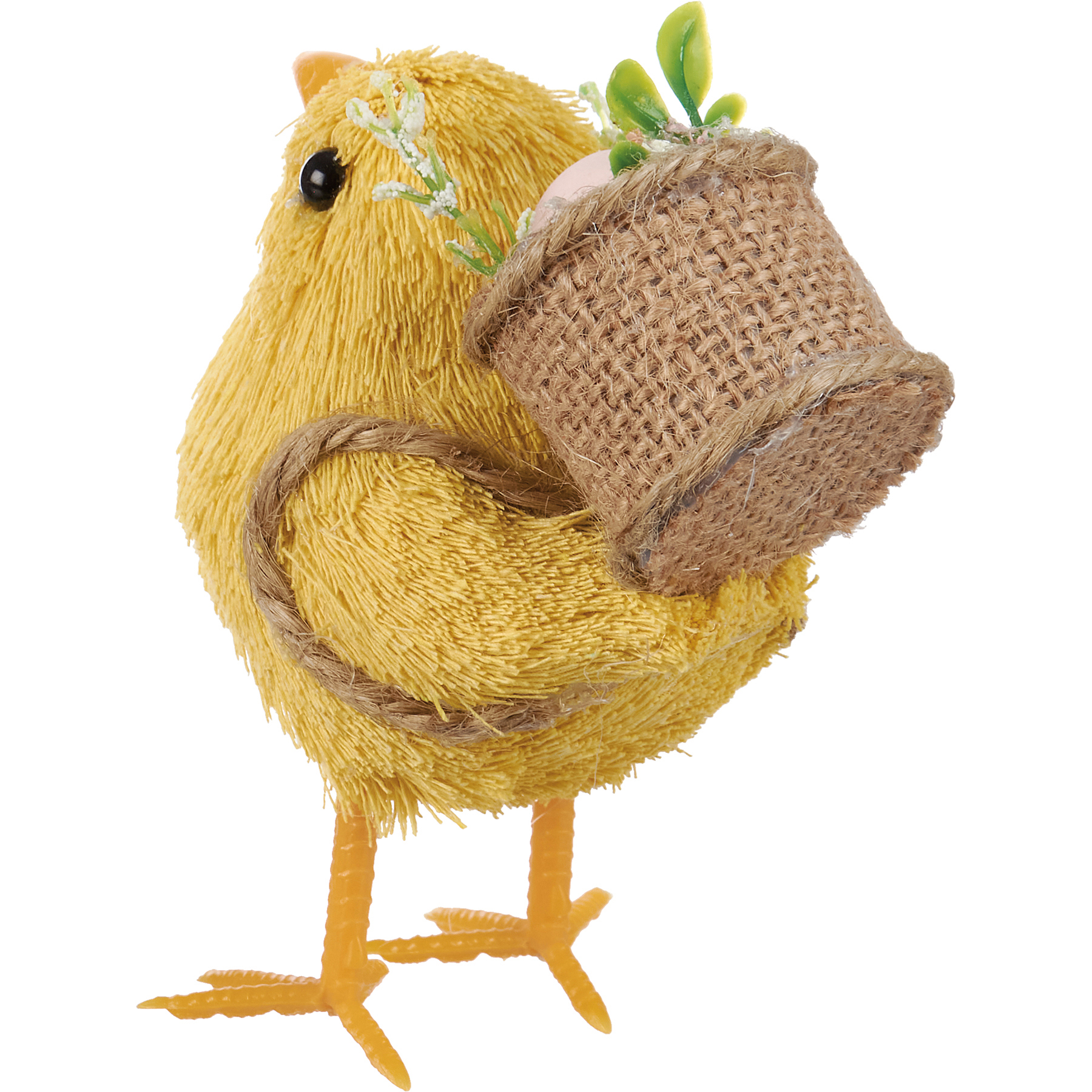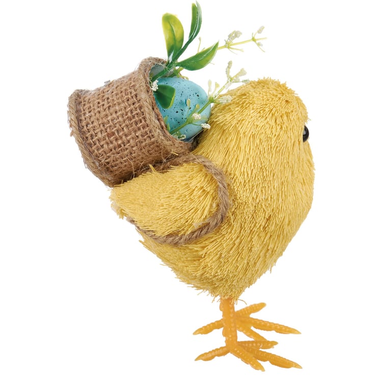 A delightful set of three chicks from our Easter & Spring Collection with cute details that add cheer to any Easter display. Each chick features a bristle texture for the body with a jute basket on their back holding various colored speckled eggs and faux greenery. Designed to free-stand on flat surface. Our Spring Chicks critter set displays well on their own or as a collection with other critters. WARNING: CHOKING HAZARD - Contains small parts. This is not a toy.