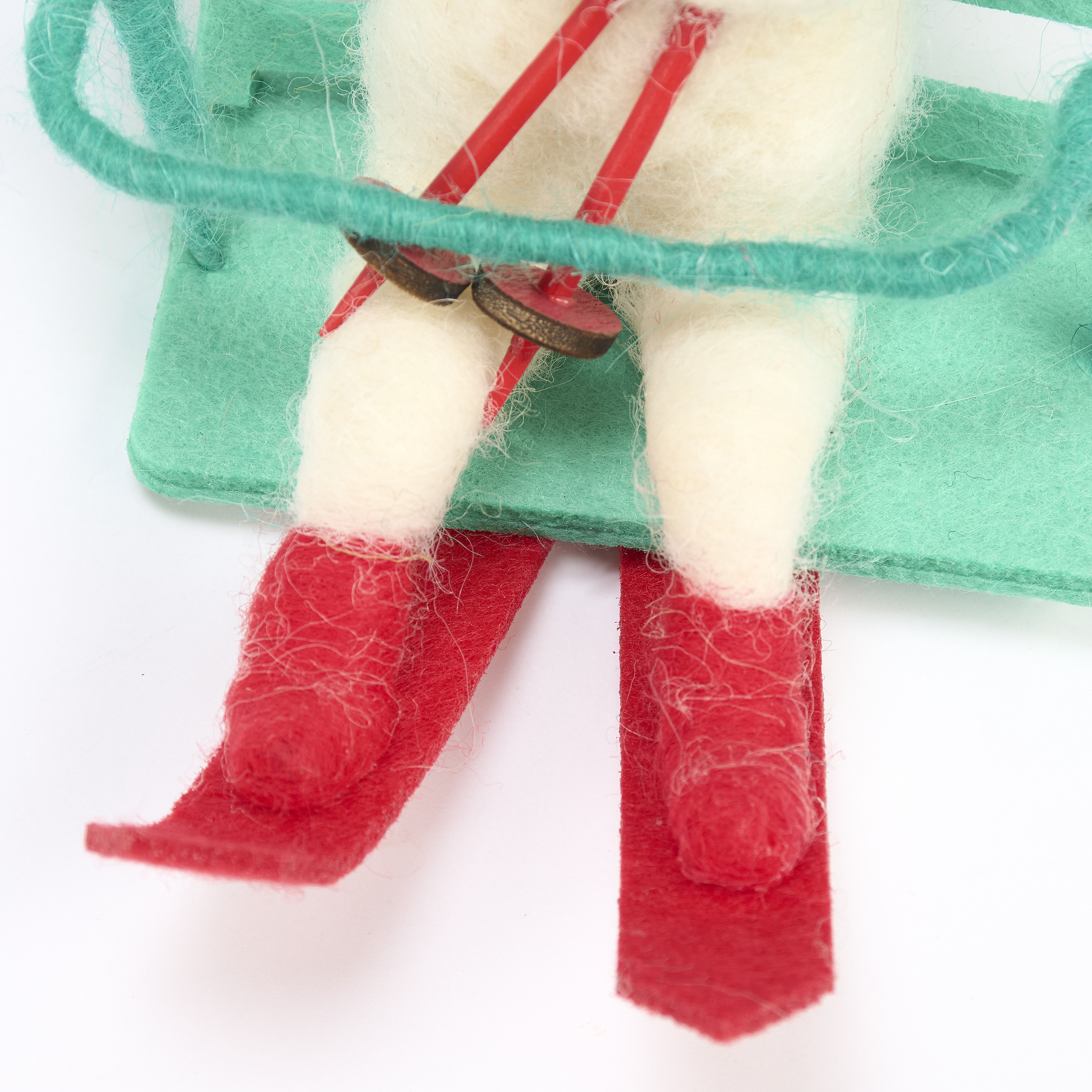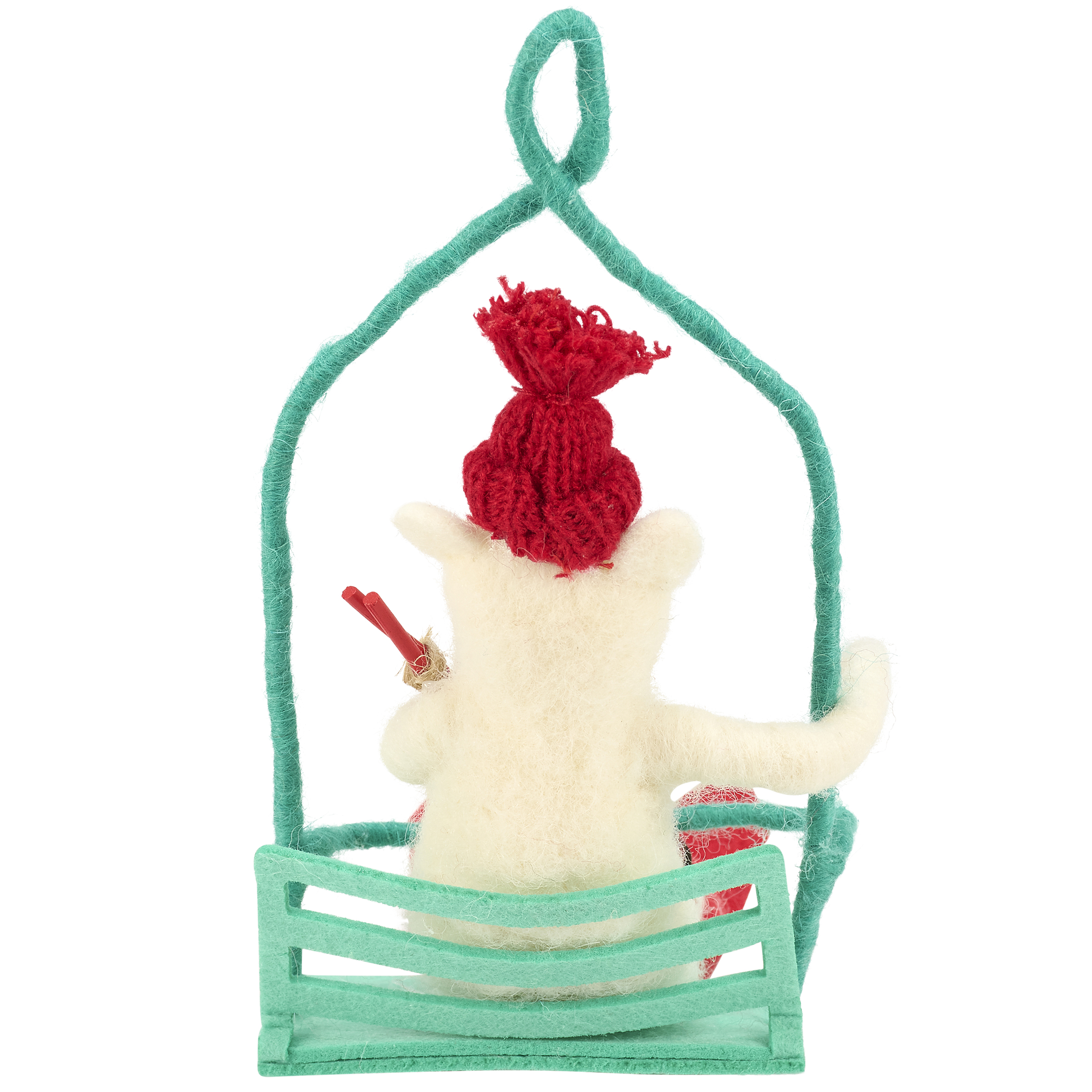 A felt critter from our Christmas Collection displaying a polar bear dressed for skiing sitting on a ski lift perfect for adding character to any seasonal display. Skiing bear critter features cute handmade details including wooden ski poles as well as knit winter accessories and felt ski lift. Our Ski Lift Bear critter is designed to free-stand on flat surface for display. Contains small parts; this is not a toy. A fun ski-themed home accent that displays well alone or as a collection with other critters.