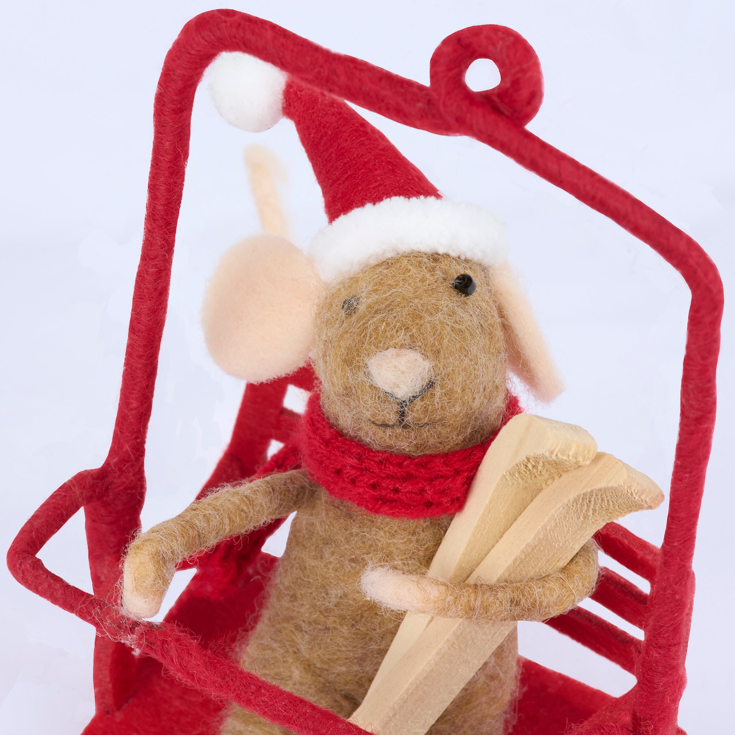 A felt critter from our Christmas Collection displaying happy mouse riding a ski lift that is perfect for adding character to any Christmas display at home or at work. Skier mouse critter features cute handmade details including a knit scarf and wooden skis in its arm. Our Ski Lift Mouse critter is ready to hang for display via the attached hanger. Contains small parts; this is not a toy. A cute ski themed home accent that displays well alone or as a collection with other critters.