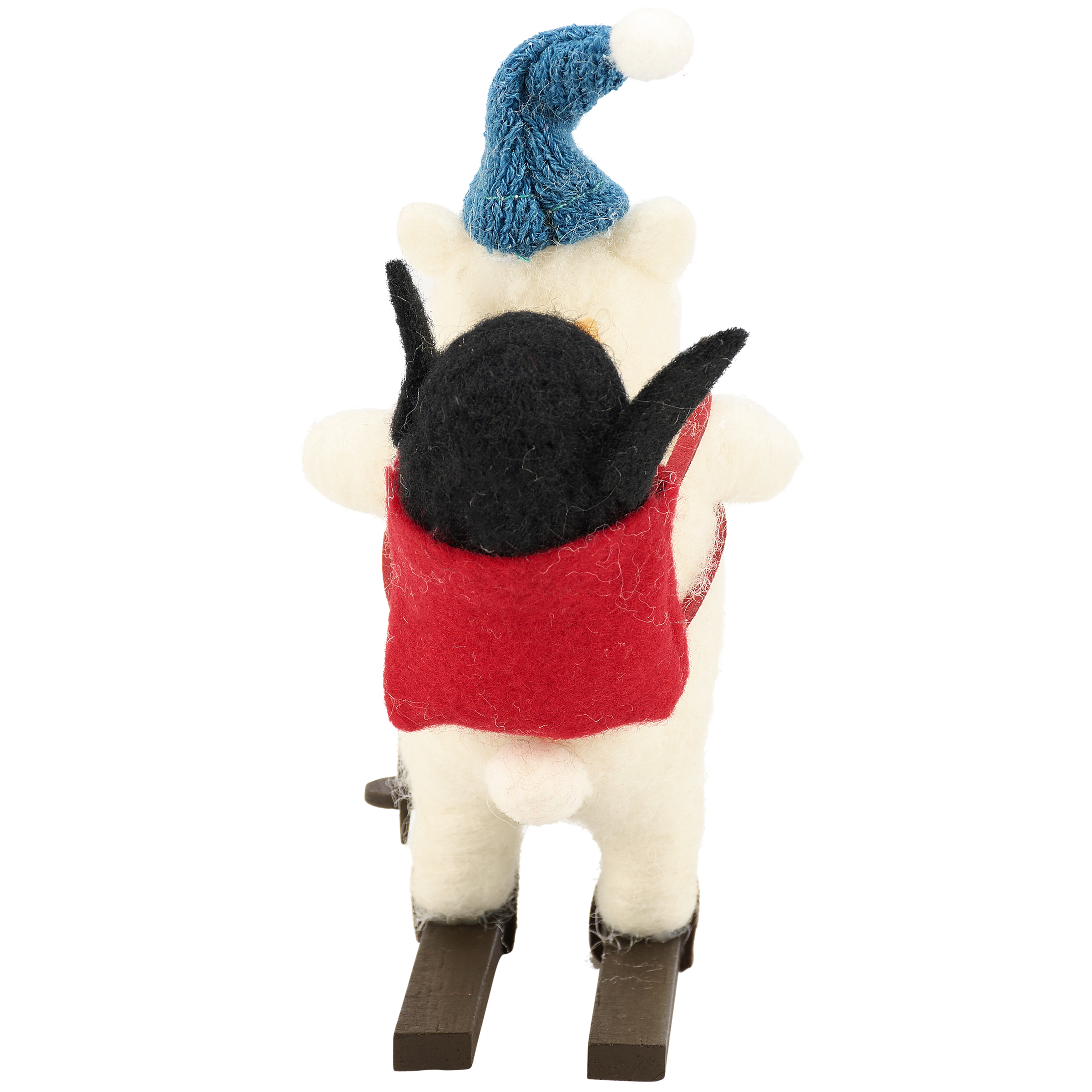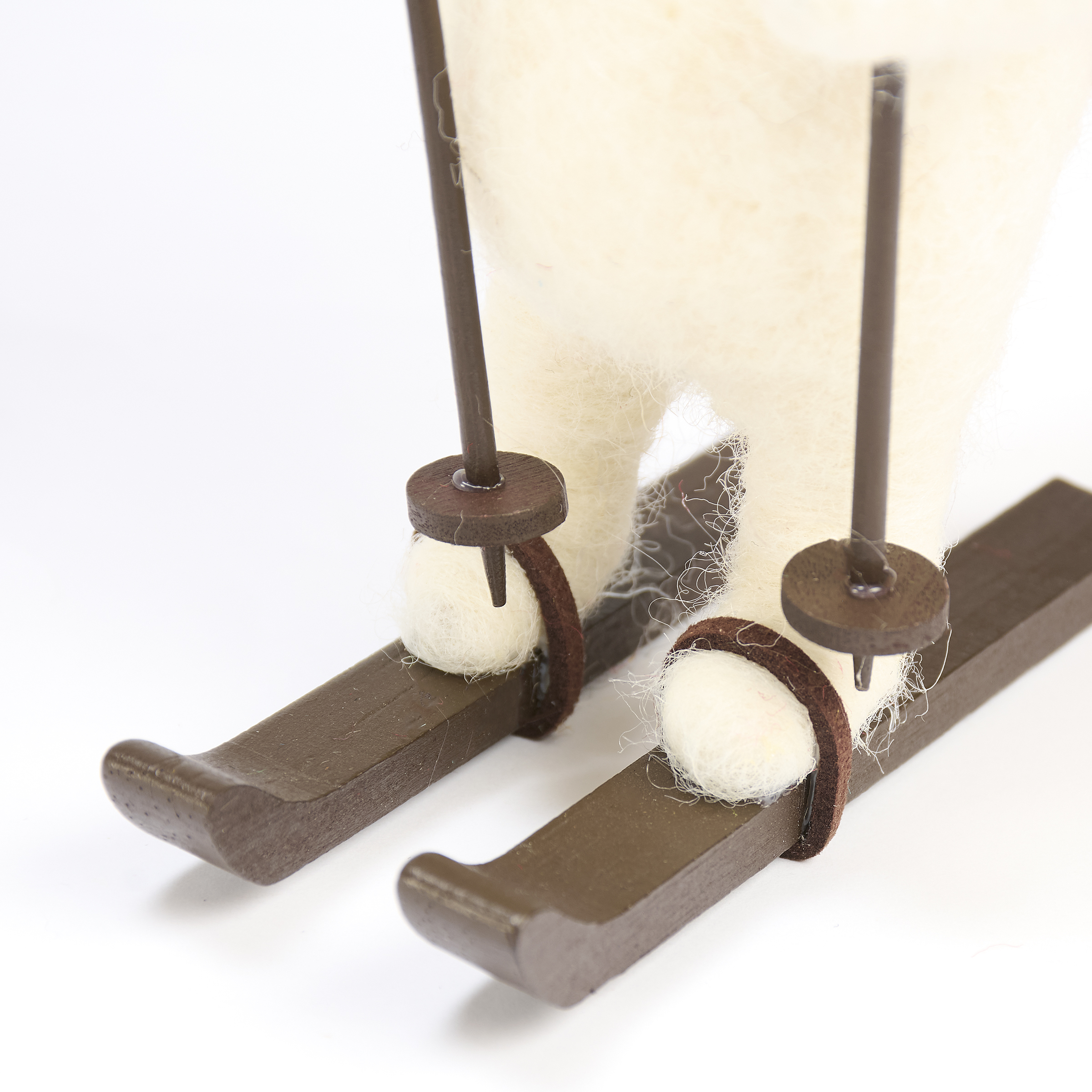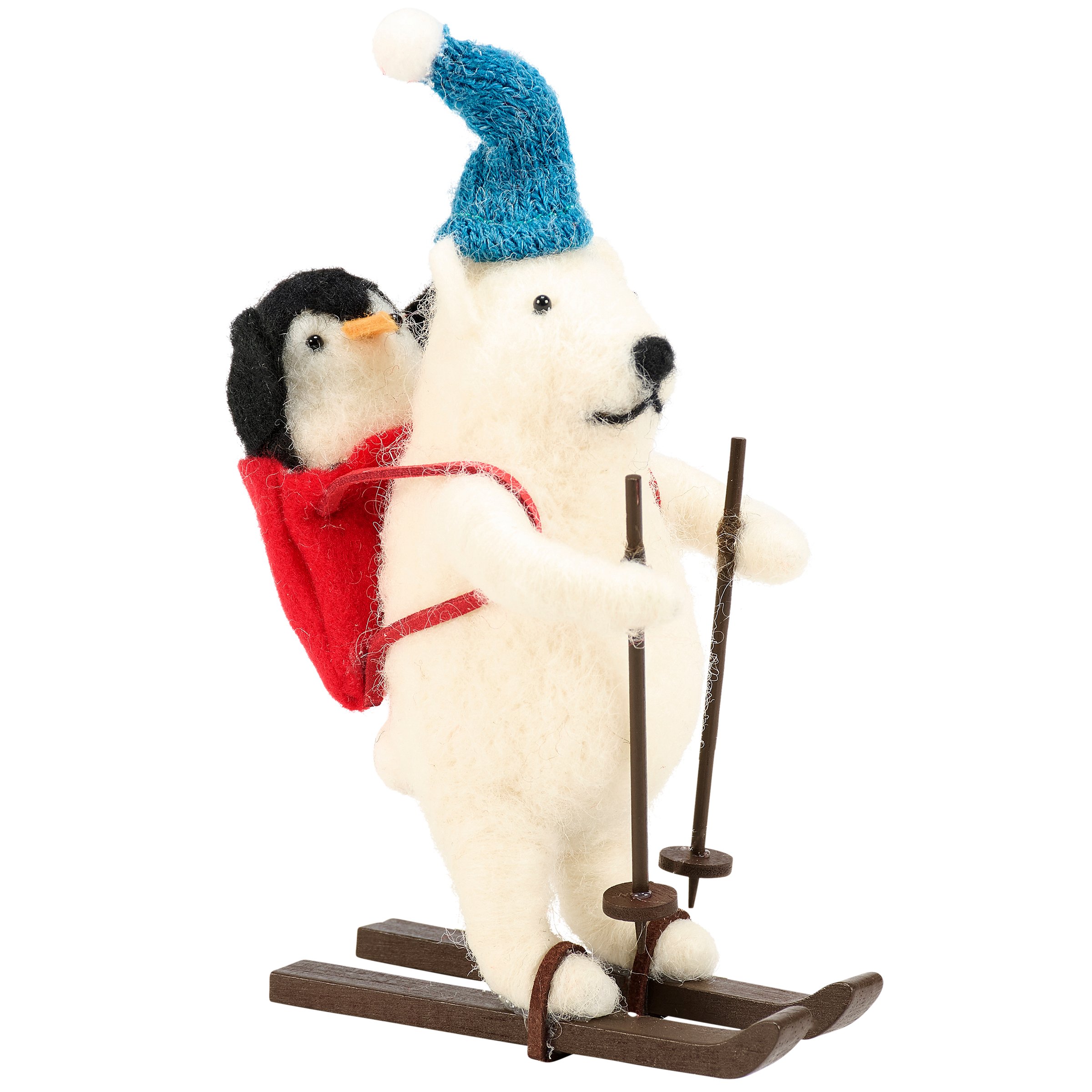 A felt critter from our Christmas Collection displaying a polar bear dressed for skiing with a penguin in its backpack perfect for adding character to any seasonal display. Skiing bear critter features cute handmade details including wooden ski poles and skis as well as knit winter accessories. Our Skiing Bear critter is designed to free-stand on flat surface for display. Contains small parts; this is not a toy. A fun ski-themed home accent that displays well alone or as a collection with other critters.