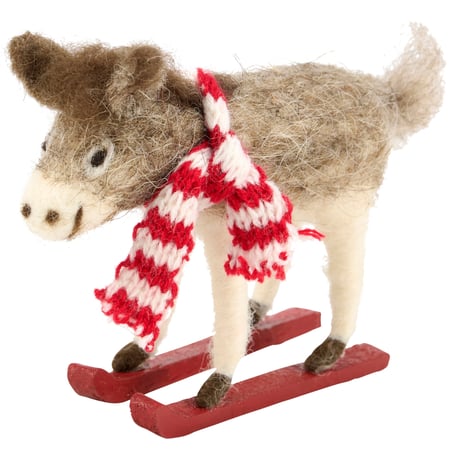 A felt critter from our Christmas Collection displaying a donkey dressed for skiing perfect for adding character to any seasonal display. Skiing donkey critter features cute handmade details including wooden skis and knit winter scarf. Our Skiing Donkey critter is designed to free-stand on flat surface for display. Contains small parts; this is not a toy. A fun ski-themed home accent that displays well alone or as a collection with other critters.
