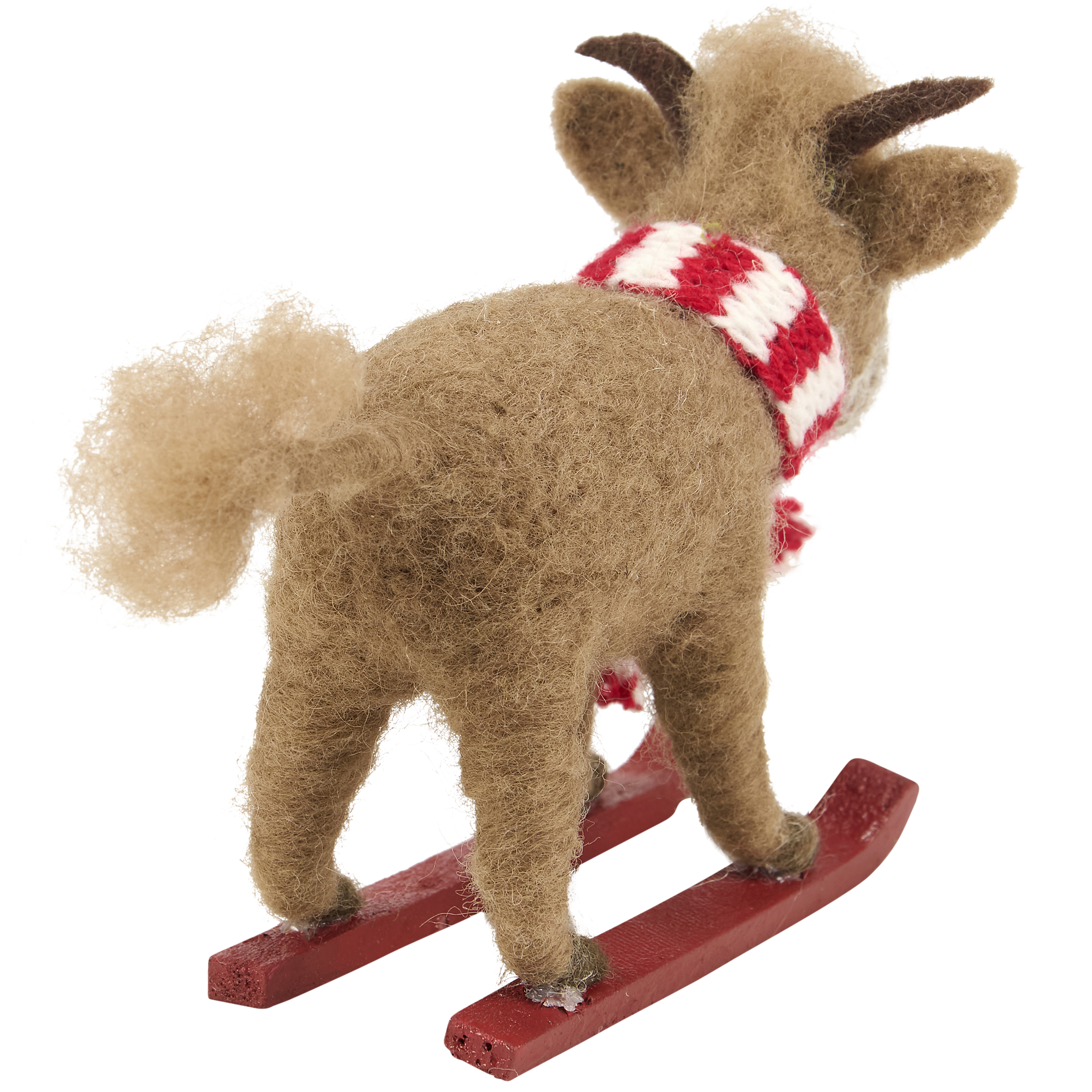 A felt critter from our Christmas Collection displaying a highland cow dressed for skiing perfect for adding character to any seasonal display. Skiing cow critter features cute handmade details including wooden skis and knit winter scarf. Our Skiing Highland Cow critter is designed to free-stand on flat surface for display. Contains small parts; this is not a toy. A fun ski-themed home accent that displays well alone or as a collection with other critters.
