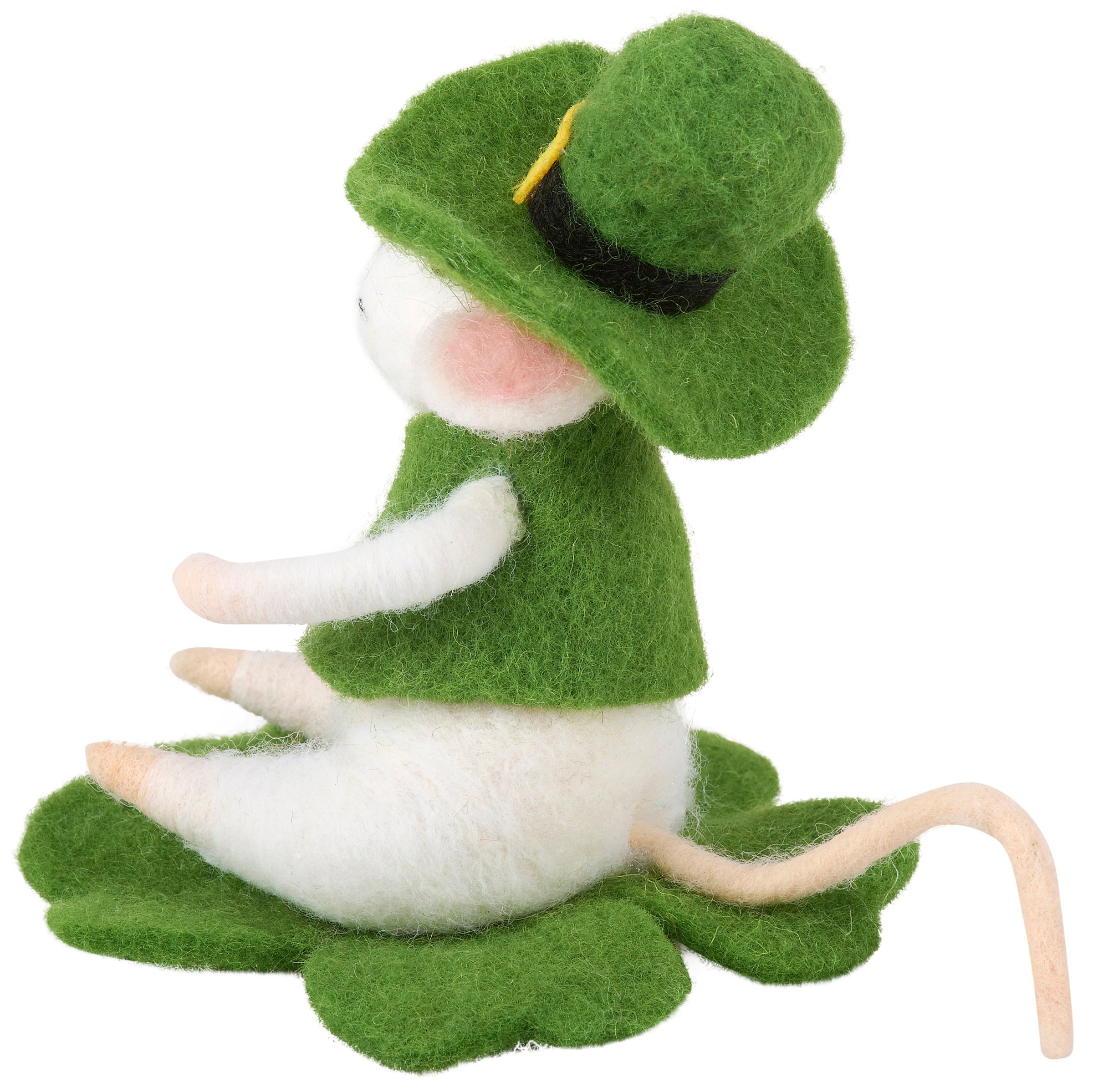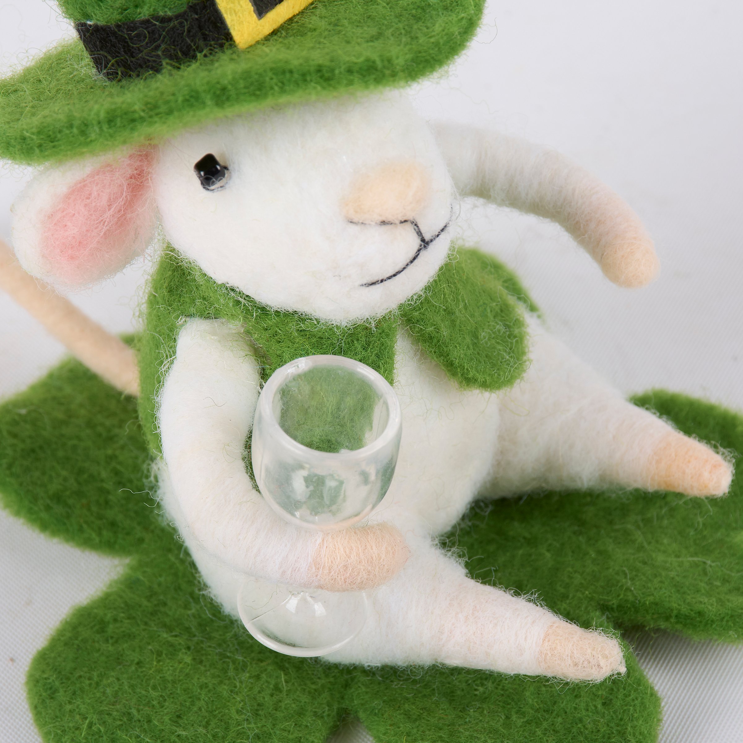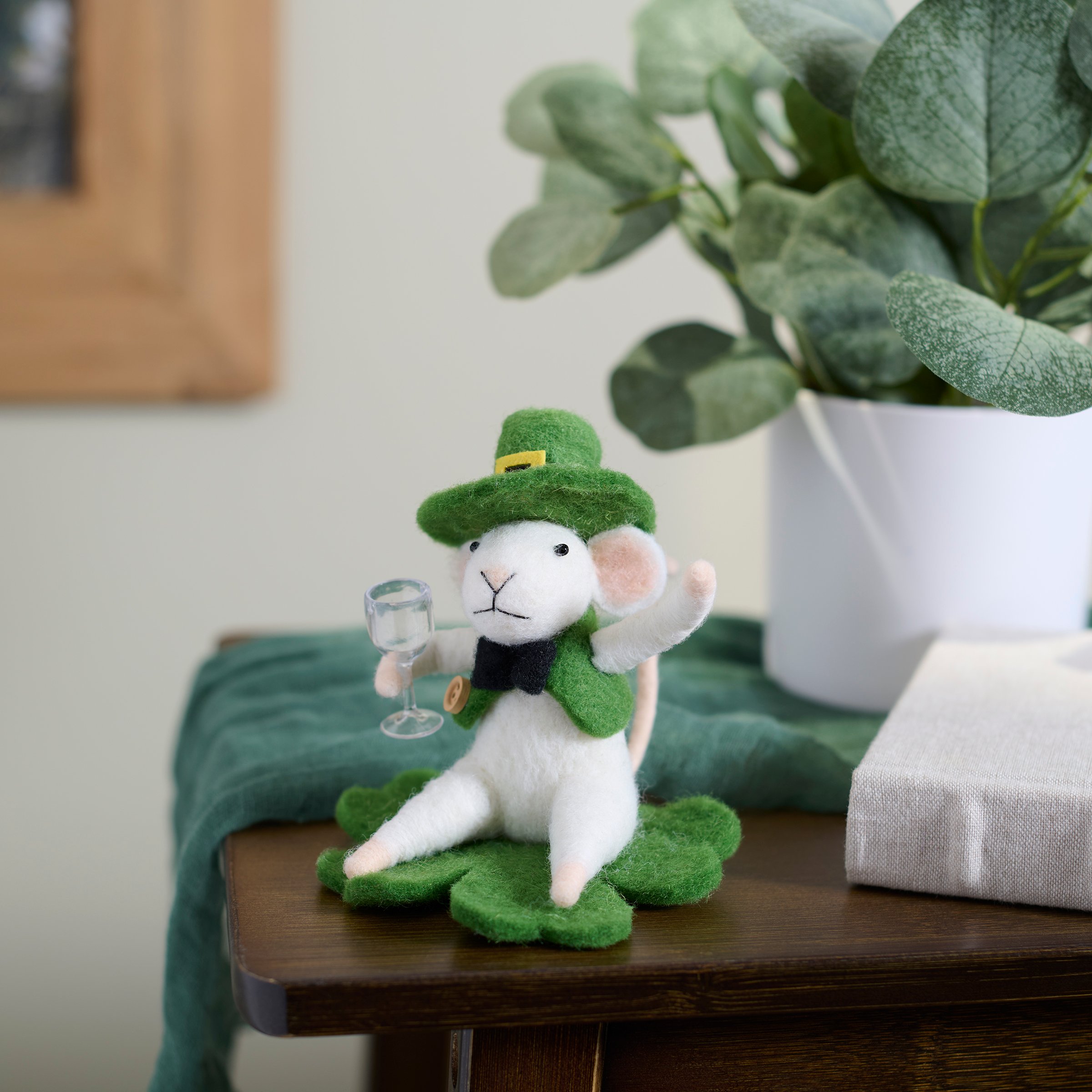 A felt critter from our St. Patrick's Day Collection displaying a white mouse wearing a leprechaun inspired outfit perfect for adding animal charm to any seasonal display. St. Patrick's Day mouse critter features cute handmade details including a felt shamrock base as well as a drink glass in its hand. Our St. Paddy & Shamrock critter is designed to free-stand on flat surface for display. Contains small parts; this is not a toy. A charming St. Patrick's Day home accent that displays well alone or as a collection with other critters.