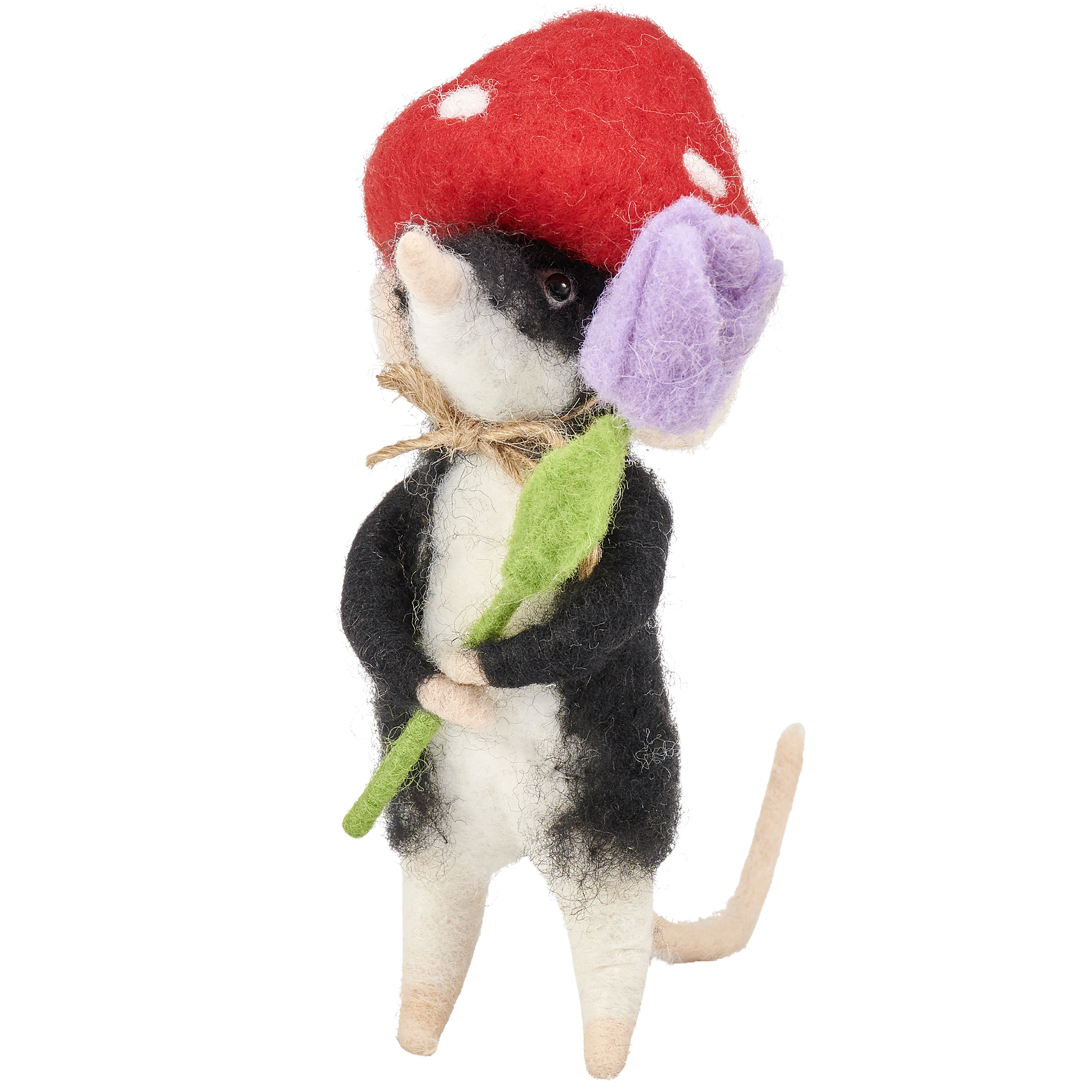 A felt critter from our Cottagecore Collection displaying a charming mole with a garden inspired design perfect for adding character to any space. Mouse critter features cute handmade details including a felt tulip and felt mushroom hat with jute tie. Our Tulip Mole critter is designed to free-stand on flat surface for display or hang for display via the attached hanger. Contains small parts; this is not a toy. A fun garden-themed home accent that displays well alone or as a collection with other critters.