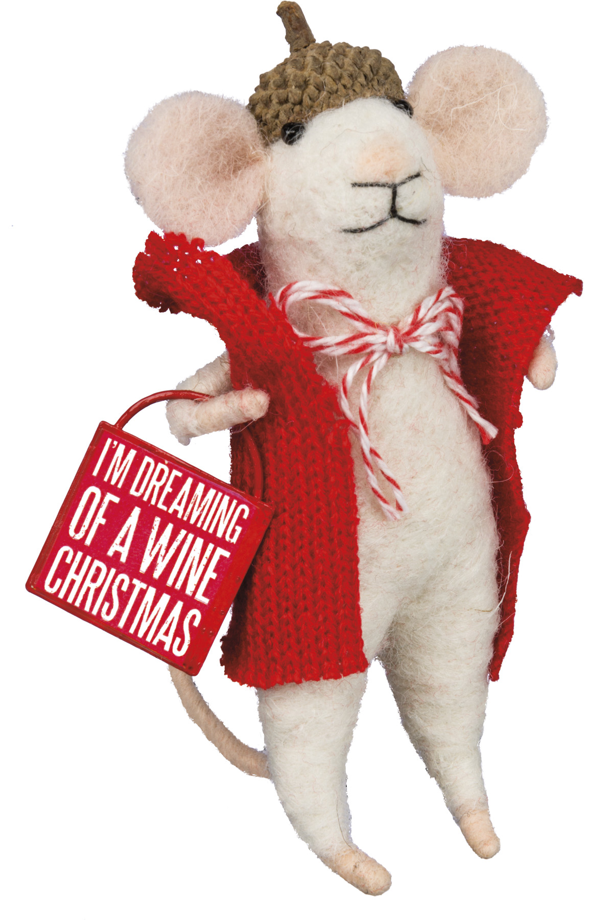 A Christmas-themed felt critter lending an "I'm Dreaming Of A Wine Christmas" sentiment, knit vest hat, and bow tie detail, and clear filament hanger for easy decorating. Great to display with other critter styles. This is not a toy.