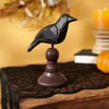 A black carved wooden crow atop a spindle. Complements well with other pieces in collection or existing decor.