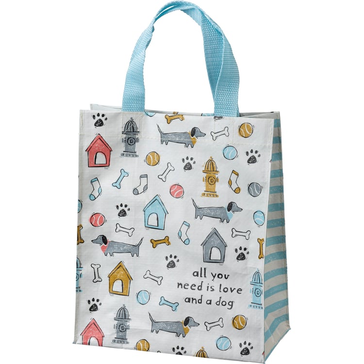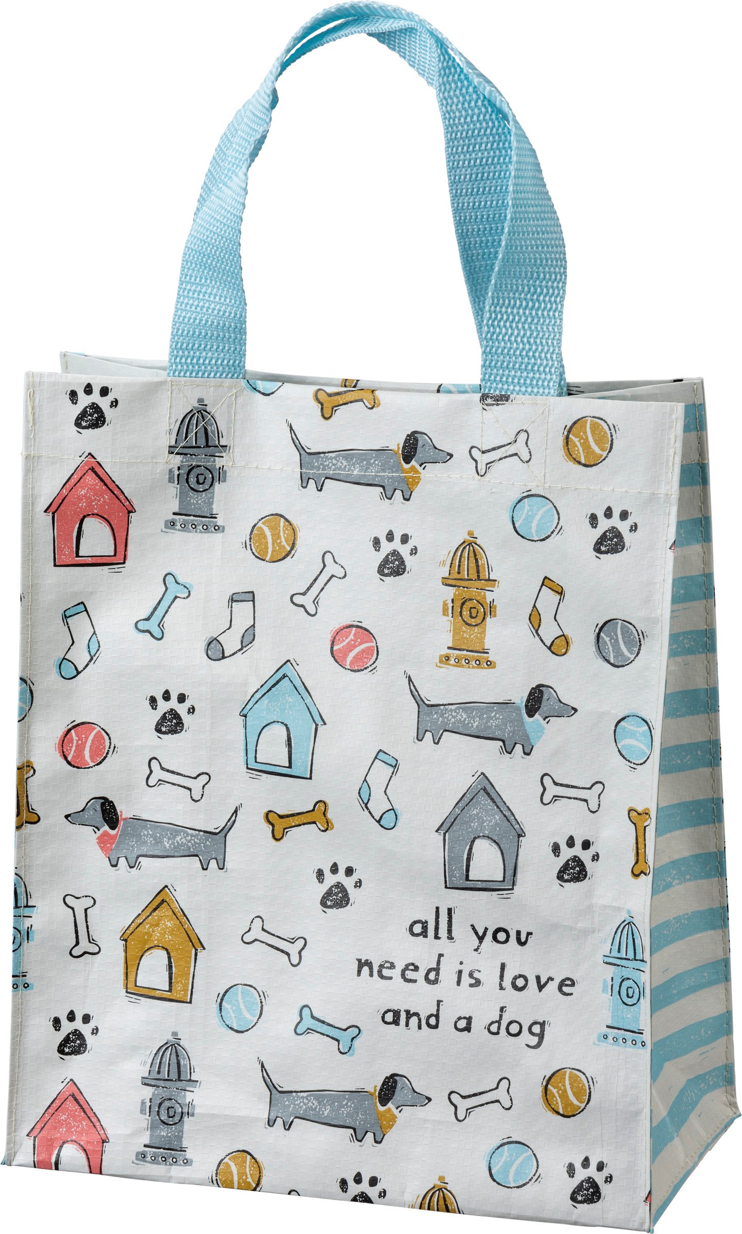 A double-sided daily tote lending an "All You Need Is Love And A Dog" sentiment with all-over dog themed block print design, blue and cream striped gusset, and complementing blue straps. Made of post-consumer material and nylon.