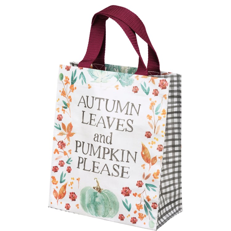 A double-sided daily tote made of post-consumer material. Features "Autumn Leaves And Pumpkin Please" sentiment, all-over autumnal floral pattern, and plaid-printed gusset. Includes two complementing nylon straps.