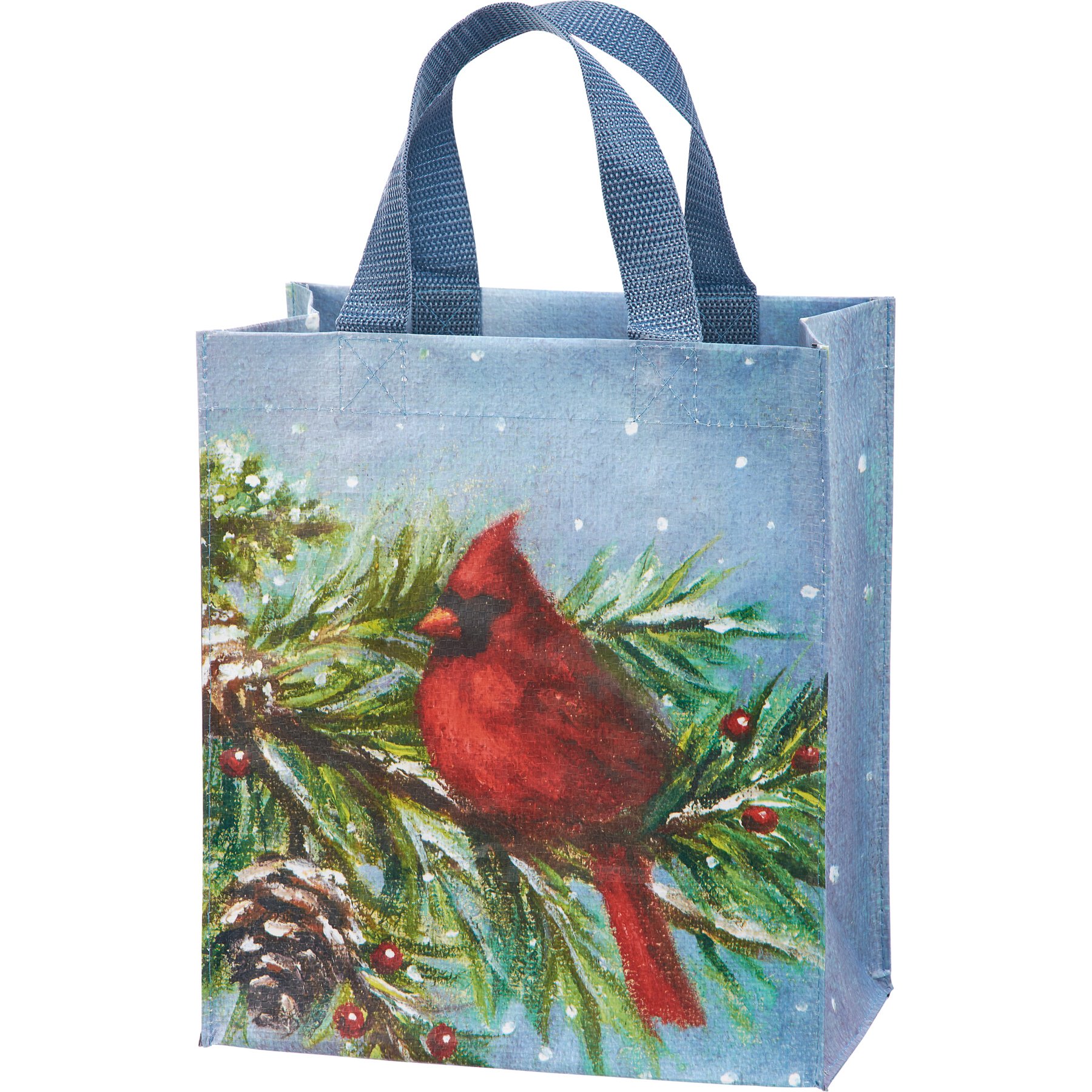 A full color holiday daily tote displaying a double-sided design of a cardinal in a winter woodland. Design is replicated from original artwork painted onto burlap canvas, giving the art a unique depth and texture. Cardinal tote is made from post-consumer material and includes complementing nylon straps. Featured in our Christmas Collection. California Residents see Prop 65 Notice.