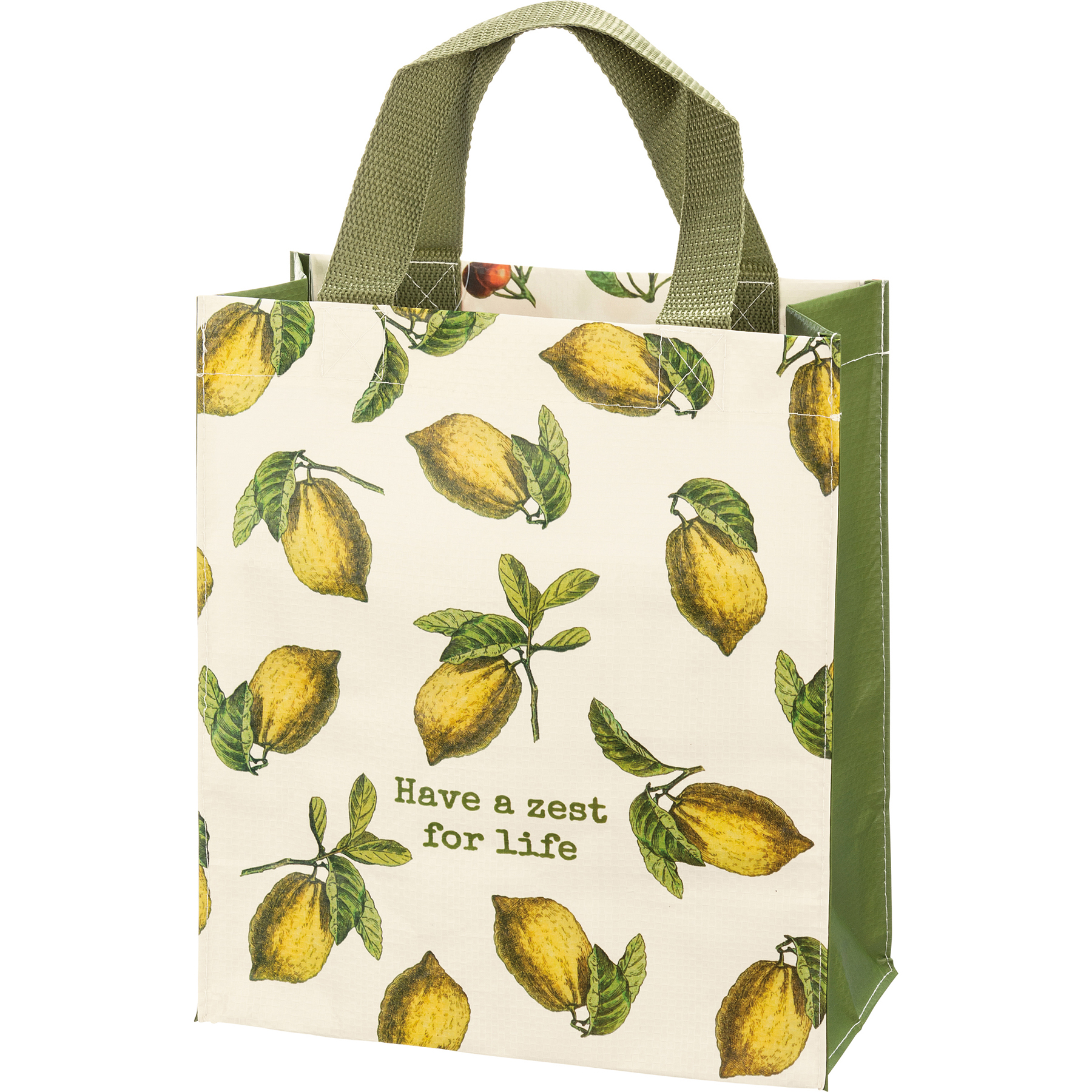 Made of post-consumer material, this double-sided daily tote features vintage-inspired cherry designs on one side with "Have A Cherry Sweet Day" sentiment, and lemons on the other side with "Have A Zest For Life" sentiment. Gusset features muted green color for added interest. Bag includes complementing nylon straps.