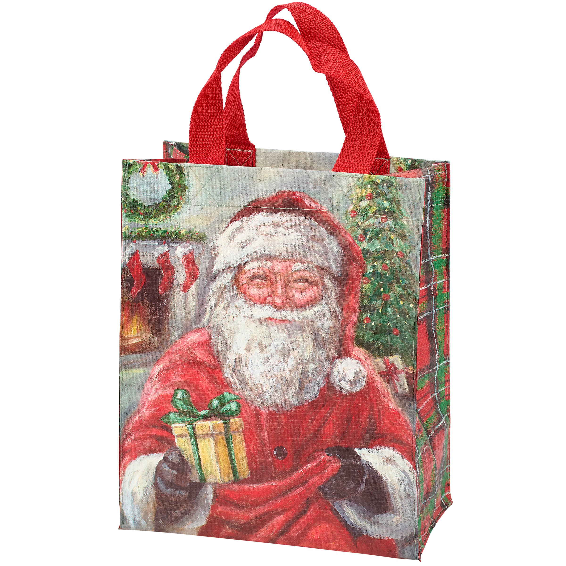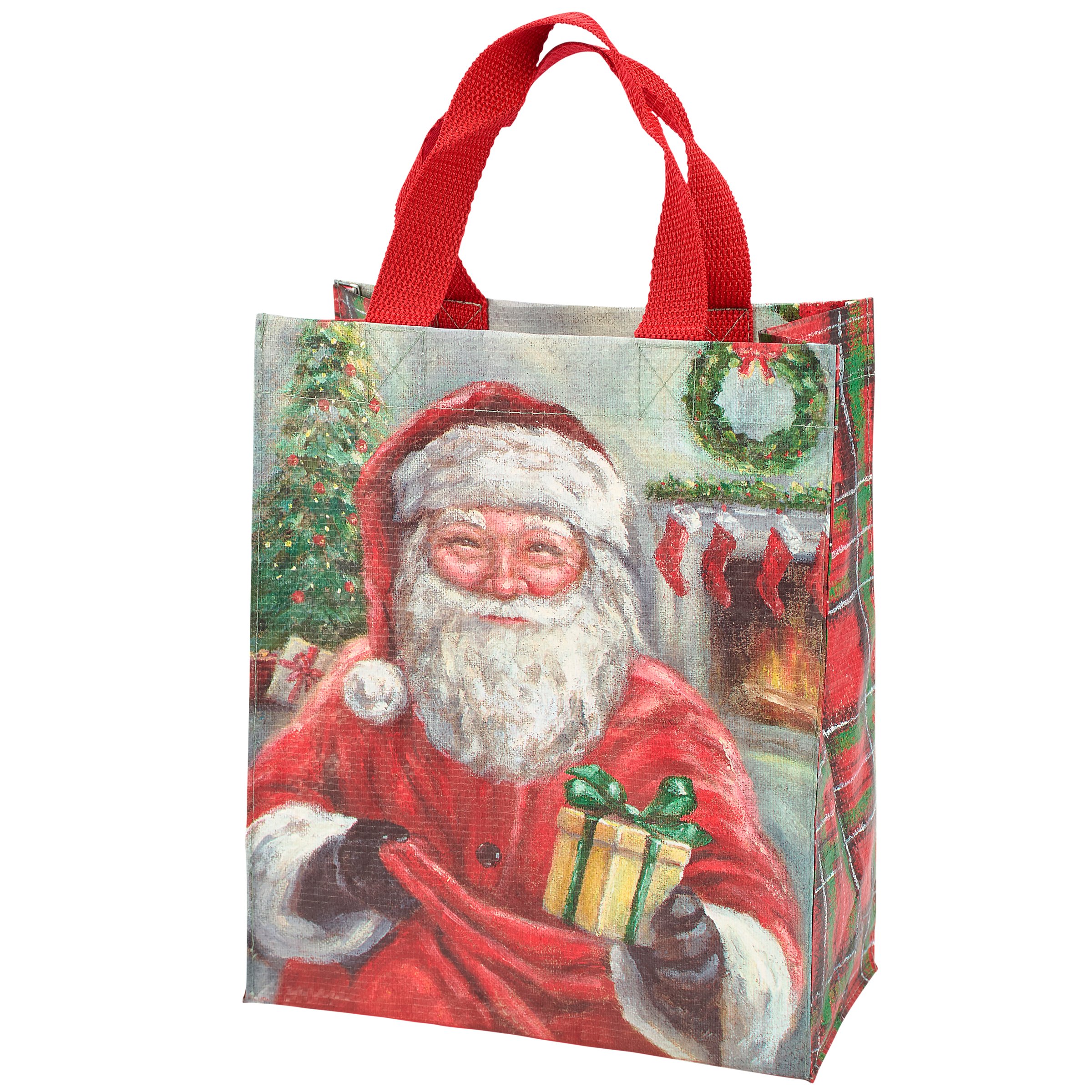 A double-sided daily tote from our Christmas Collection displaying a charming scene of Santa delivering presents on Christmas eve replicated from original artwork painted onto burlap canvas, giving the art a unique depth and texture. Christmas tote gussets feature a coordinating red and green plaid pattern. Our Christmas Eve Santa daily tote is made from eco-friendly post-consumer material and includes complementing red nylon straps. Seasonal tote folds flat for compact storage. A Christmas tote perfect for a seasonal accessory or great for reusable gift wrapping.