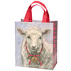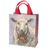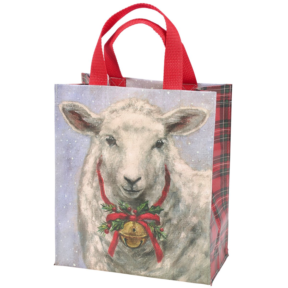 A double-sided daily tote from our Christmas Collection displaying a charming winter scene of a sheep wearing a holiday bell replicated from original artwork painted onto burlap canvas, giving the art a unique depth and texture. Christmas tote gussets feature a coordinating red and green tartan pattern. Our Festive Sheep daily tote is made from eco-friendly post-consumer material and includes complementing red nylon straps. Seasonal tote folds flat for compact storage. A farm-themed Christmas tote perfect for a seasonal accessory or great for reusable gift wrapping.