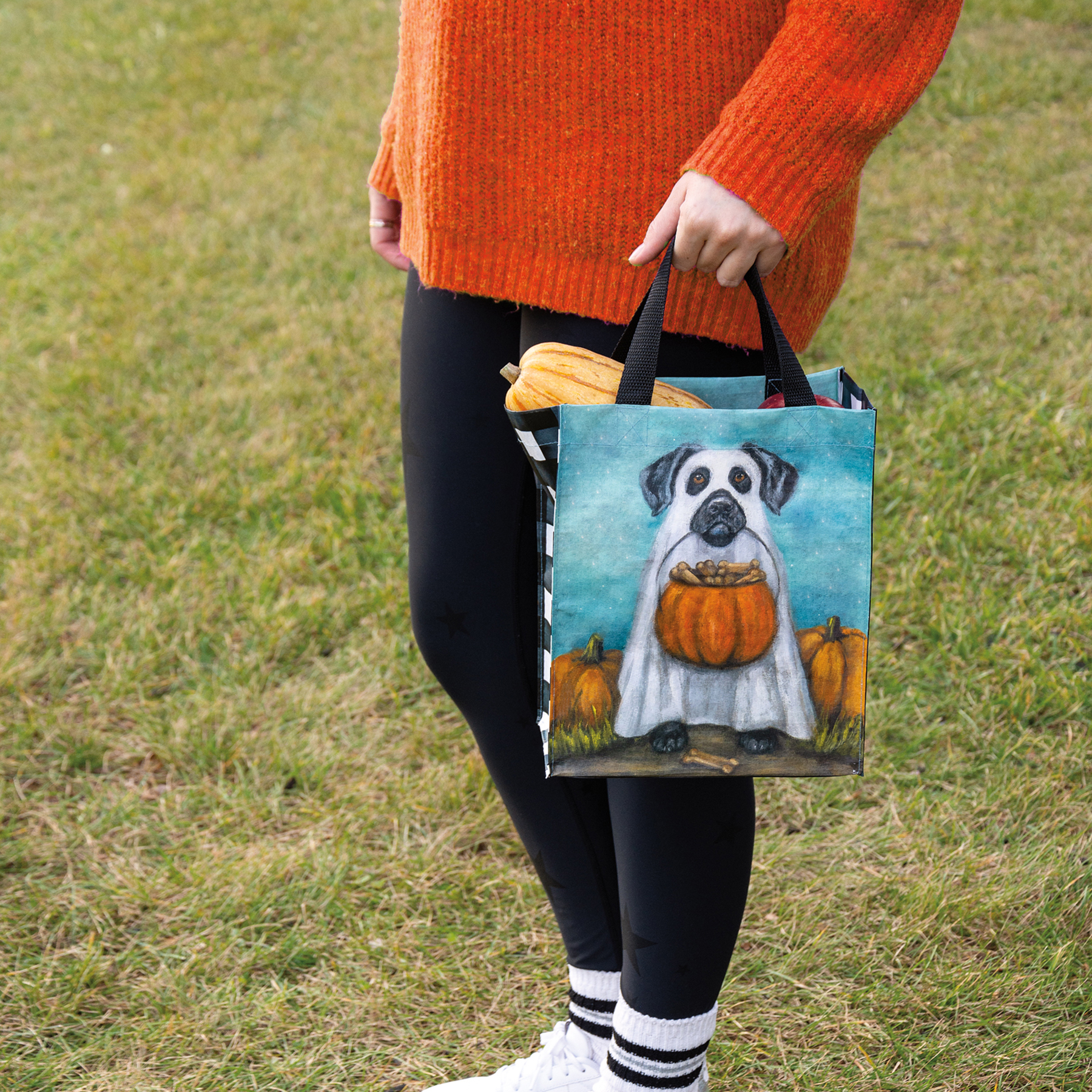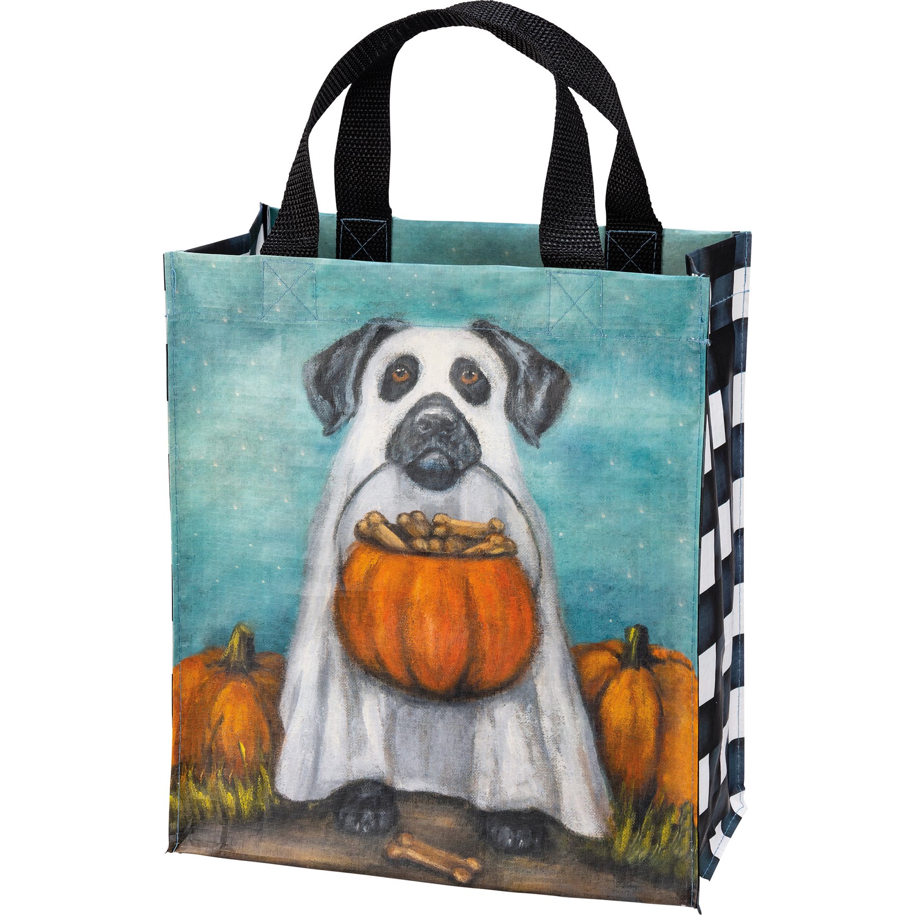 Made of post-consumer material, this double-sided daily tote features a design of a dog in a ghost costume holding a pumpkin bucket filled with treats. Design is replicated from original artwork painted onto burlap canvas, giving the art a unique depth and texture. Gusset features coordinating design. Our Ghost Dog daily tote includes complementing nylon straps for easy carrying.