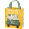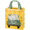 Made of post-consumer material, this double-sided daily tote features a "Sunshine In My Soul" sentiment with a truck design boasting oversized daisies and a "Happy Day Farm" logo design. Gusset features coordinating yellow plaid pattern for added interest. Bag includes complementing nylon straps.