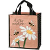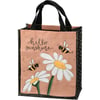Made of post-consumer material, this double-sided daily tote features a hand lettered "Hello Sunshine" sentiment with daisy and bee designs on a muted pink base. Gusset features white dots on a black base for added interest. Bag includes complementing nylon straps.