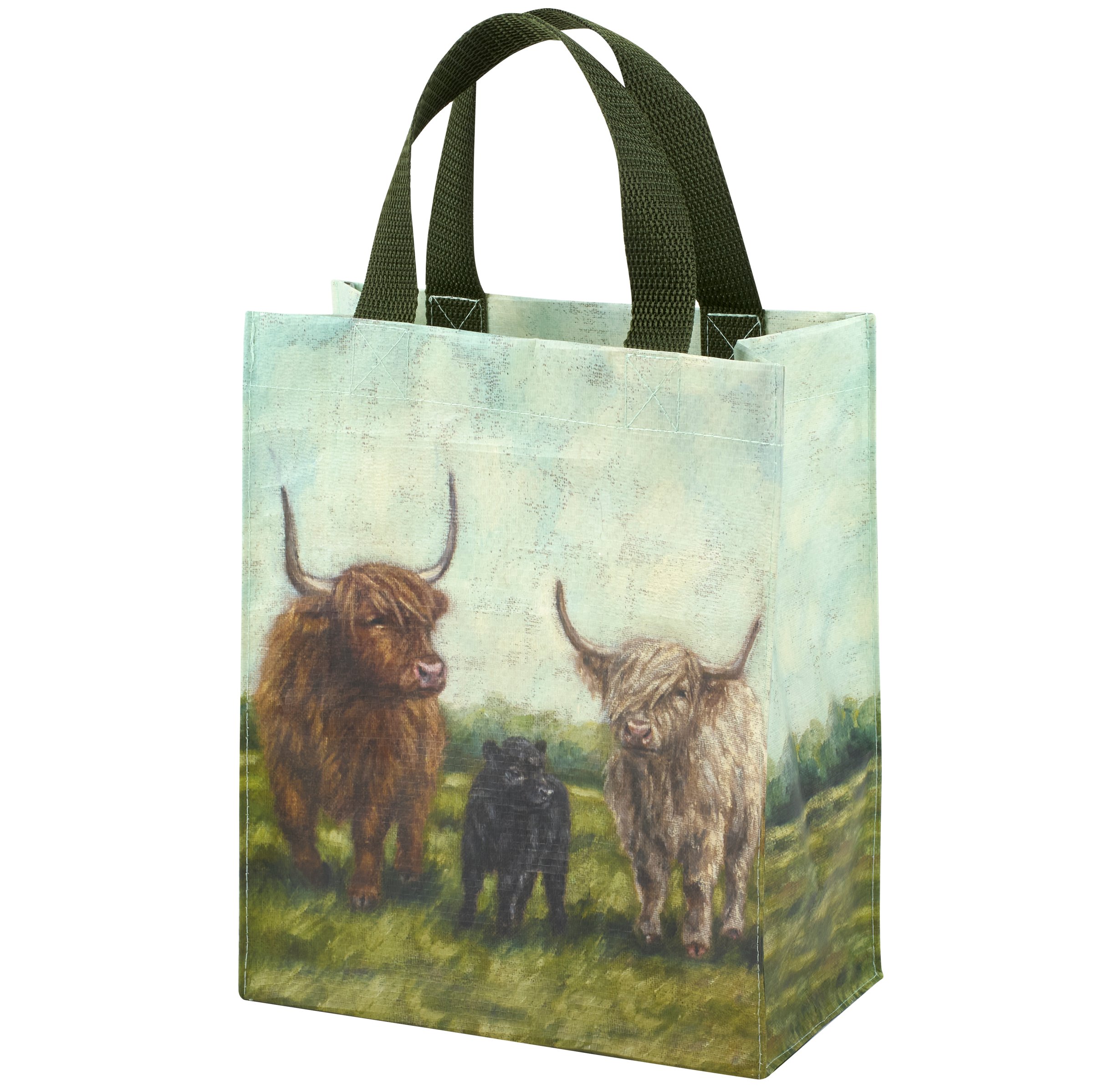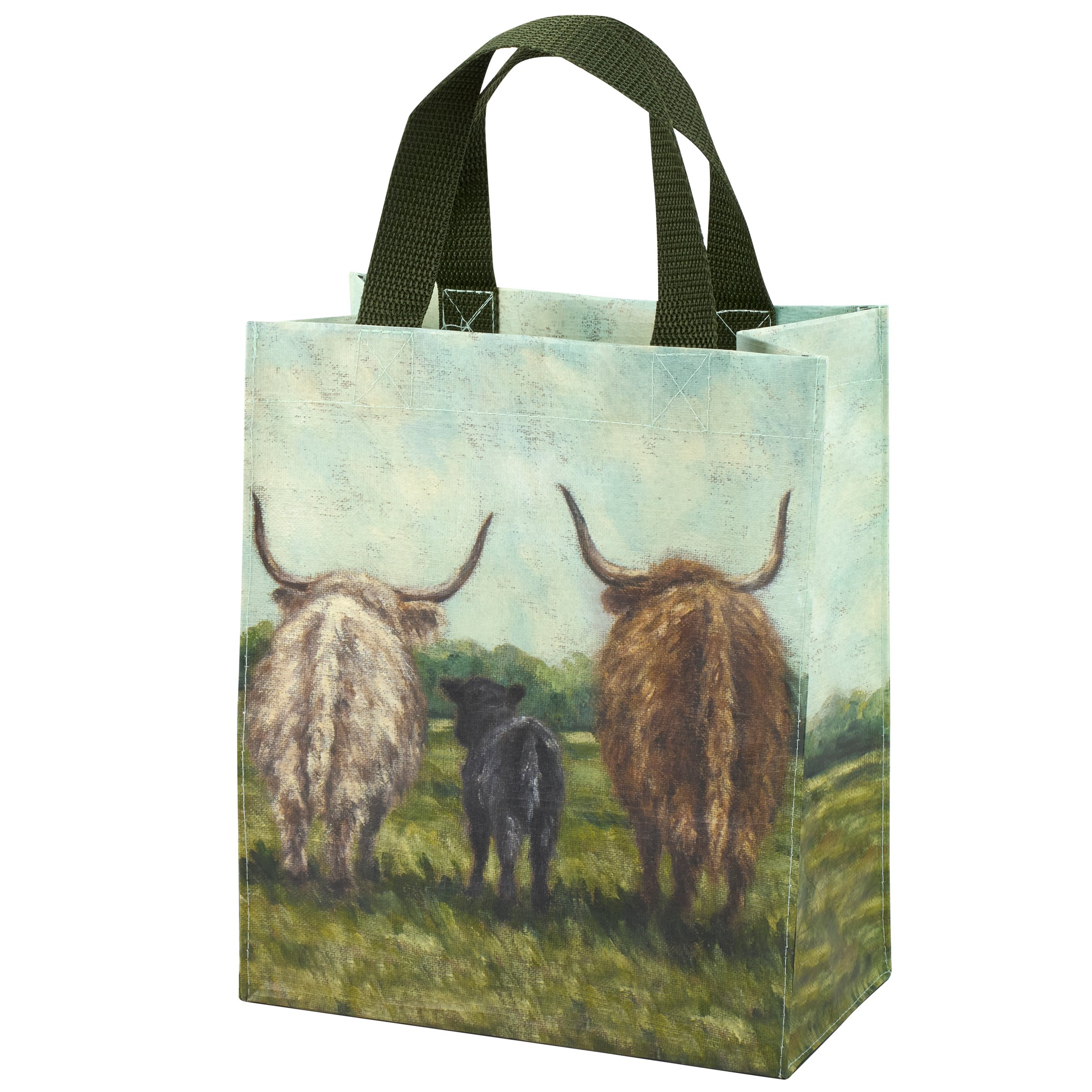 A double-sided daily tote from our Farmhouse Collection displaying a charming farm scene of highland cows and a calf in a field with front and back perspectives on each side. Tote gussets feature a coordinating field design. Highland cow family design is replicated from original artwork painted onto burlap canvas, giving the art a unique depth and texture. Our Highland Family tote is made from eco-friendly post-consumer material and includes complementing green nylon straps. Everyday tote folds flat for compact storage. A farm themed tote perfect for an everyday accessory or for reusable gift wrapping.