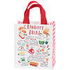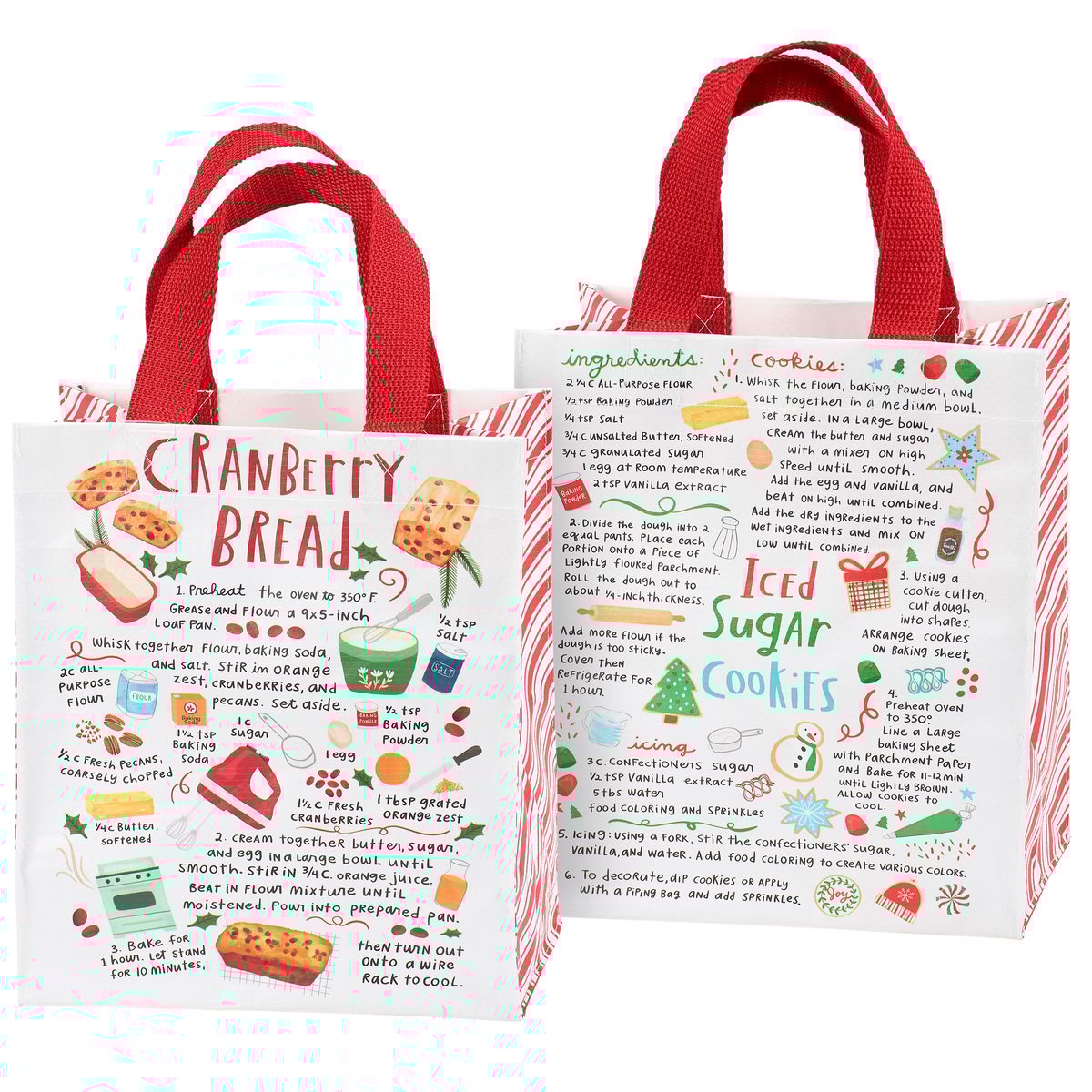 A double-sided daily tote from our Christmas Collection displaying a fun recipe inspired design replicated from original hand illustrated art. Homestead recipe design features steps for making homemade cranberry bread with coordinating illustrations. Recipe tote gussets display a candy cane inspired pattern. Our Holiday Homestead tote bag is made from eco-friendly post-consumer material and includes complementing red nylon straps. Seasonal tote folds flat for convenient storage. A homestead-themed Christmas tote perfect for a seasonal accessory or great for reusable gift wrapping.