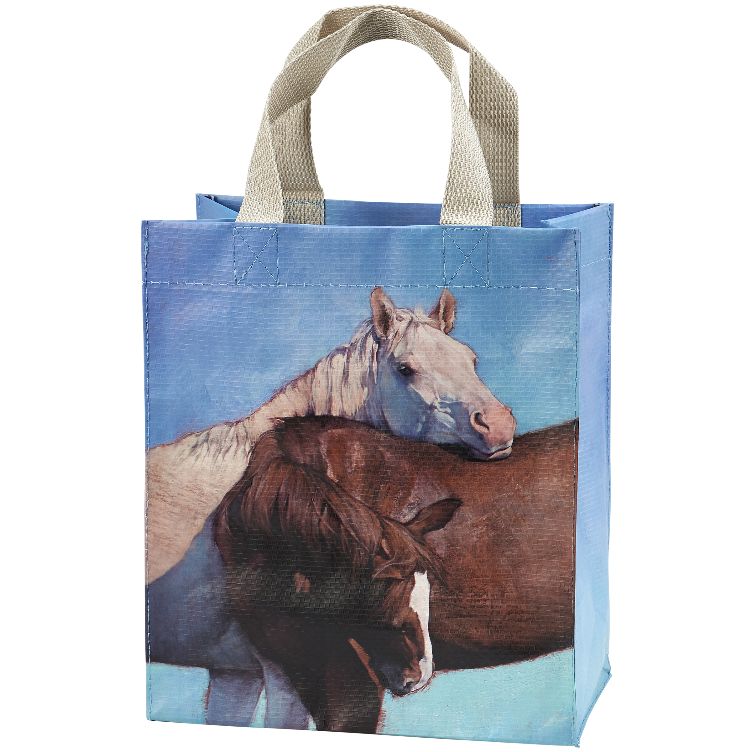 A double-sided daily tote from our Western Collection displaying a charming design of a horse resting its head another horse. Horses design is replicated from original hand painted artwork for added texture. Horse tote gussets display a coordinating blue color. Our Horse Duo tote bag is made from eco-friendly post-consumer material and includes complementing cream nylon straps. Tote bag folds flat for convenient storage. A western-themed accessory perfect for everyday use.