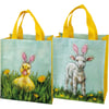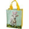 Made of post-consumer material, this double-sided daily tote features sweet lamb and duck designs with Easter bunny ears, and has coordinating yellow gussets and nylon handles. Design is replicated from original artwork painted onto burlap canvas, giving the art a unique depth and texture.