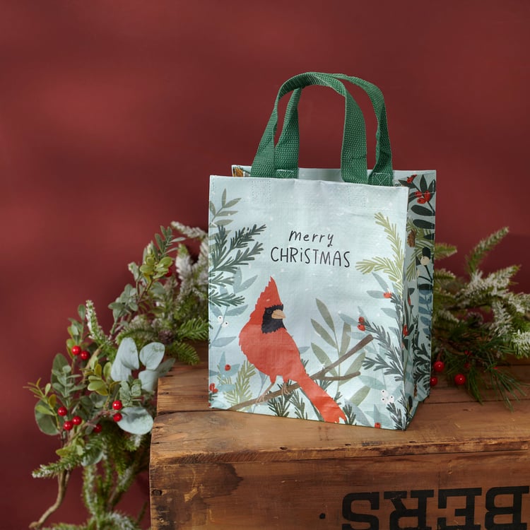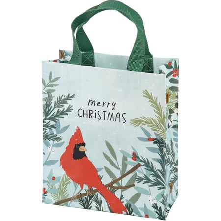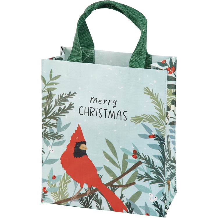 A double-sided daily tote from our Christmas Collection displaying a cardinal on a branch in a unique hand illustrated style with a "Merry Christmas" sentiment. Gusset features a coordinating tree branch designs. Our Merry Christmas tote bag is made from post-consumer material and includes complementing nylon straps. A lovely seasonal accessory perfect for on-the-go and daily activities. .