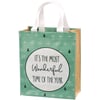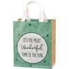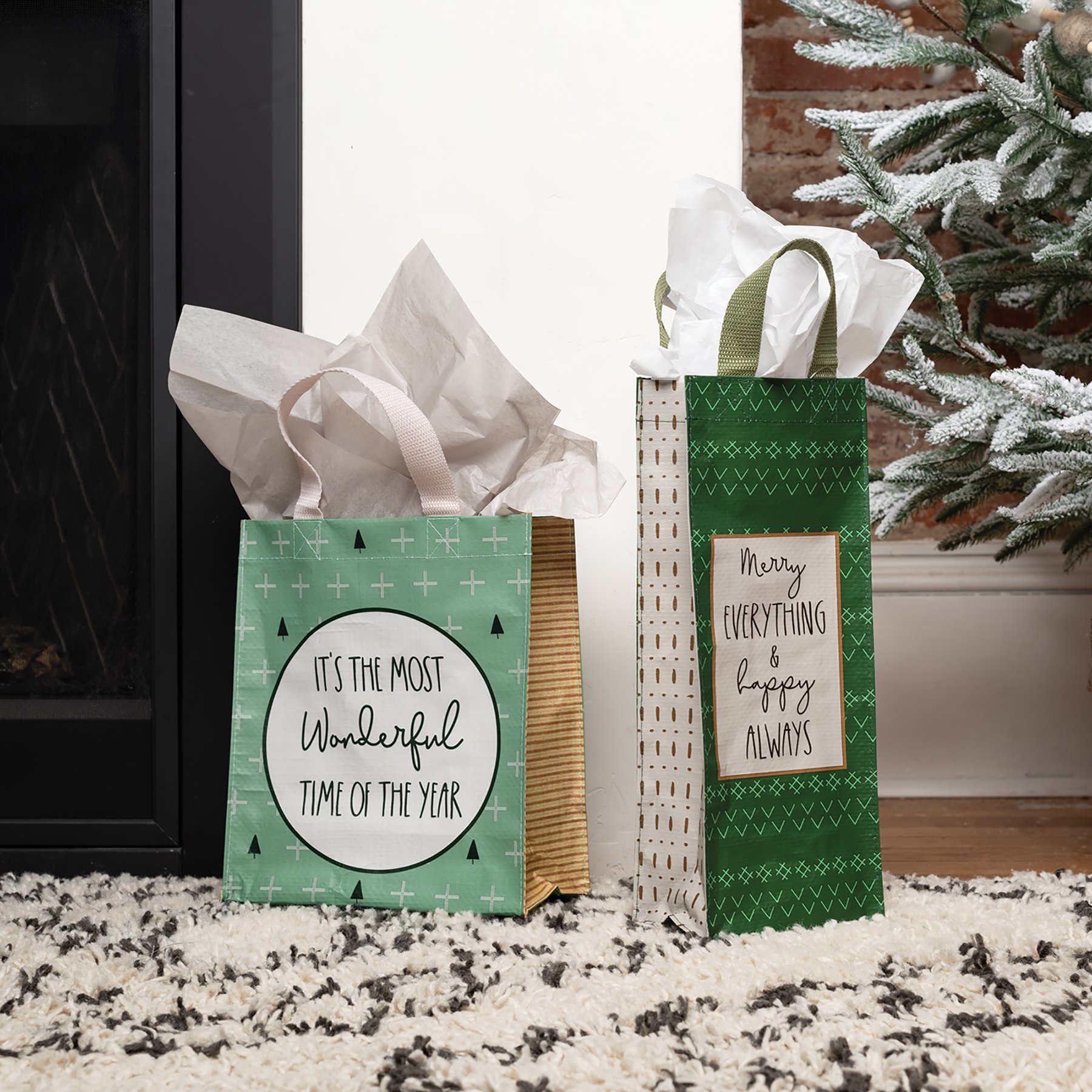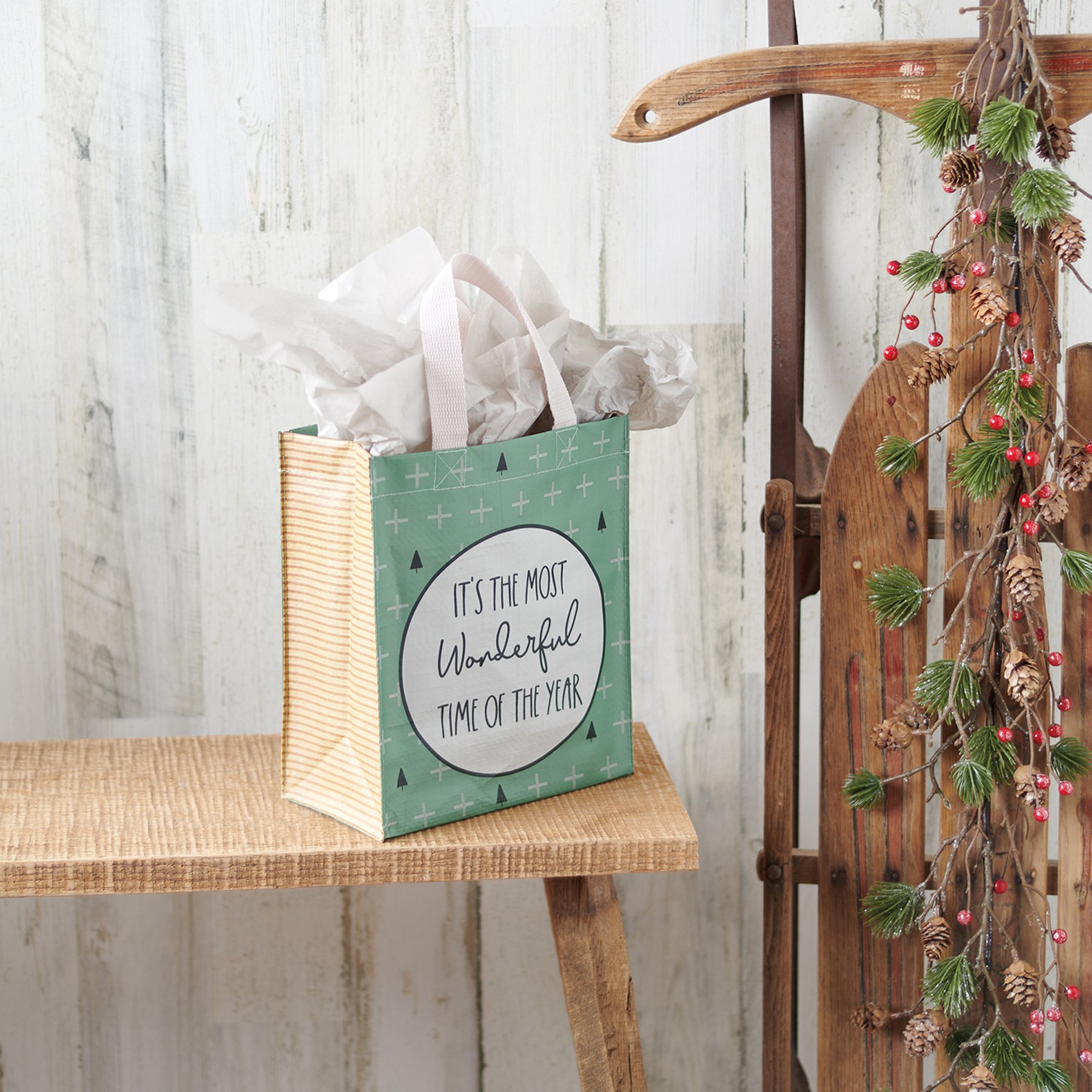 A full color holiday daily tote displaying a double-sided design of a bohemian-inspired winter theme with "It's The Most Wonderful Time Of The Year" sentiment. Gusset features a striped design. The Most Wonderful Time tote is made from post-consumer material and includes complementing nylon straps. Featured in our Christmas Collection. California Residents see Prop 65 Notice.