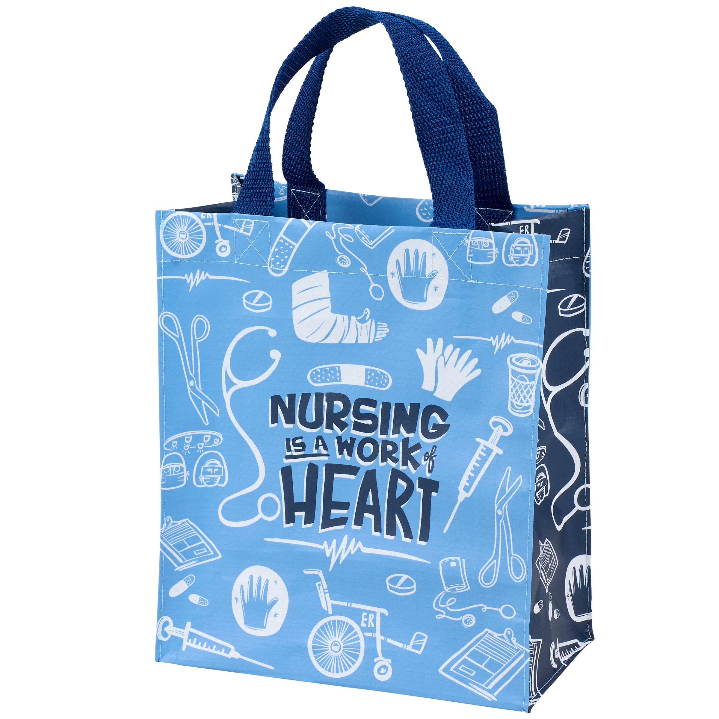 A double-sided daily tote from our Nurse Gift Collection displaying a fun nurse inspired design replicated from original hand illustrated art. Nurse tote features playful hand illustrated designs of medical items and nursing motifs surrounding a fun nurse-themed sentiment that reads "Nursing Is A Work Of Heart." Our Nursing tote bag is made from eco-friendly post-consumer material and includes complementing blue nylon straps. Nurse tote folds flat for convenient storage. A fun nurse-themed tote perfect for an everyday accessory or for reusable gift wrapping.