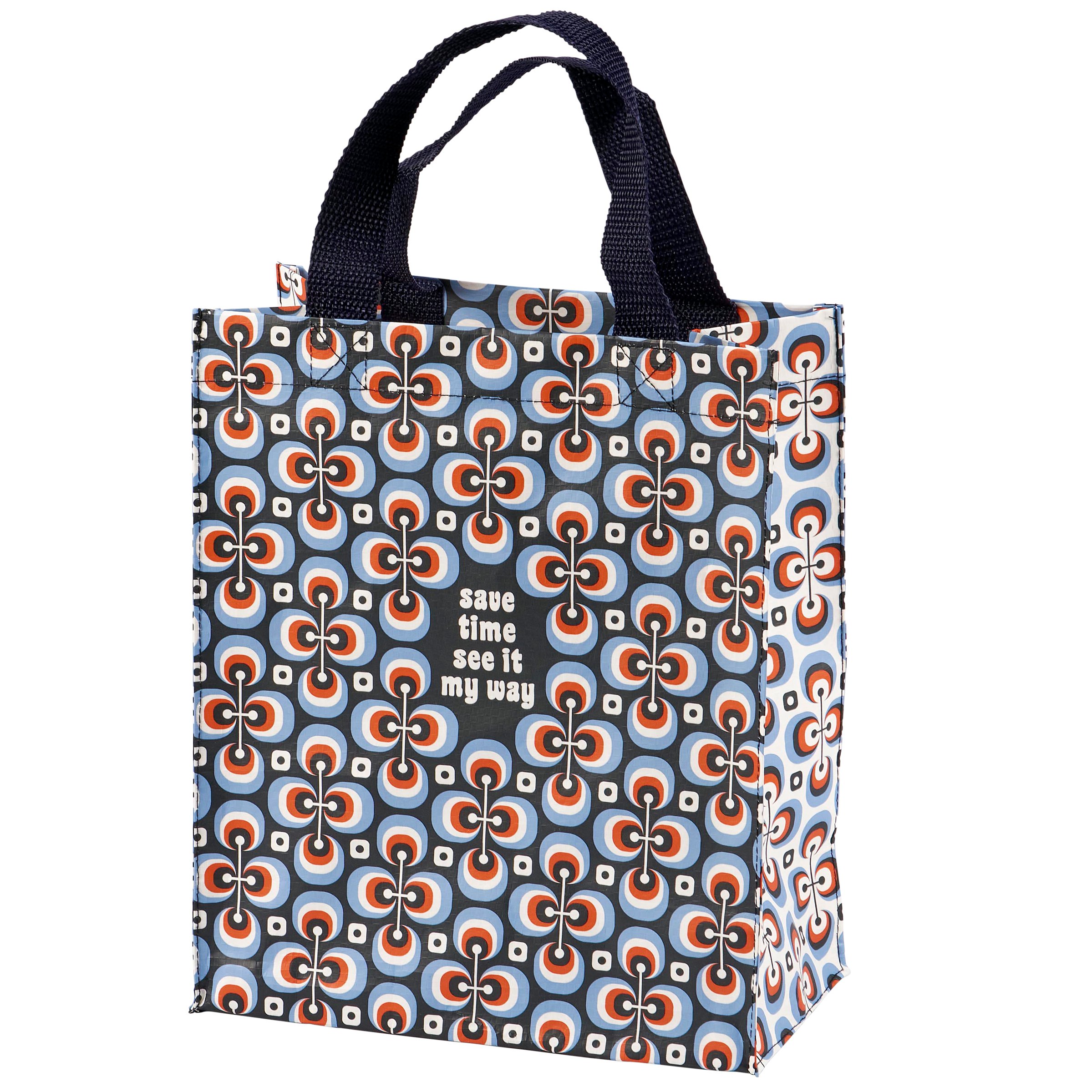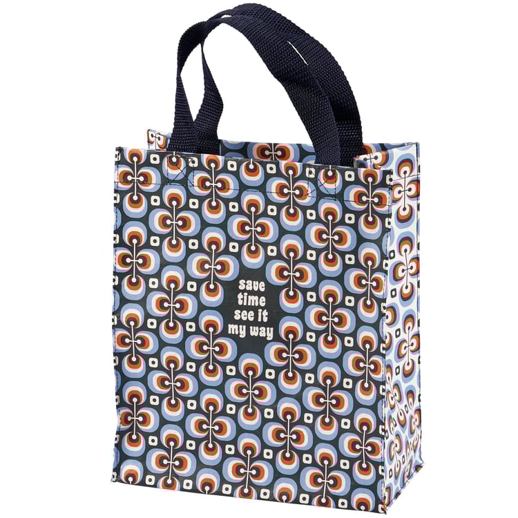 Don't bother with discussion, just read the bag. This double-sided daily tote confidently displays "Save Time - See It My Way" with a retro inspired pattern in a bold color palette. Side gussets display retro pattern in an alternate color scheme. Stylish daily tote includes coordinating hand straps in blue nylon. Questionables daily totes are made from eco-friendly post-consumer material and fold flat for easy storage. Our Save Time daily tote is an everyday accessory that calls back to a retro style while also calling out a modern mentality perfect for shopping or traveling.