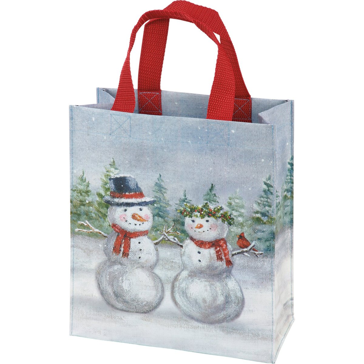 A double-sided daily tote from our Christmas Collection displaying a hand painted design of happy snowmen with a cardinal. Design is replicated from original artwork painted onto burlap canvas, giving the art a unique depth and texture. Gusset features a coordinating winter forest design. Our Snow Family daily tote is made from post-consumer material and includes complementing nylon straps. A charming seasonal accessory perfect for on-the-go and daily activities. .
