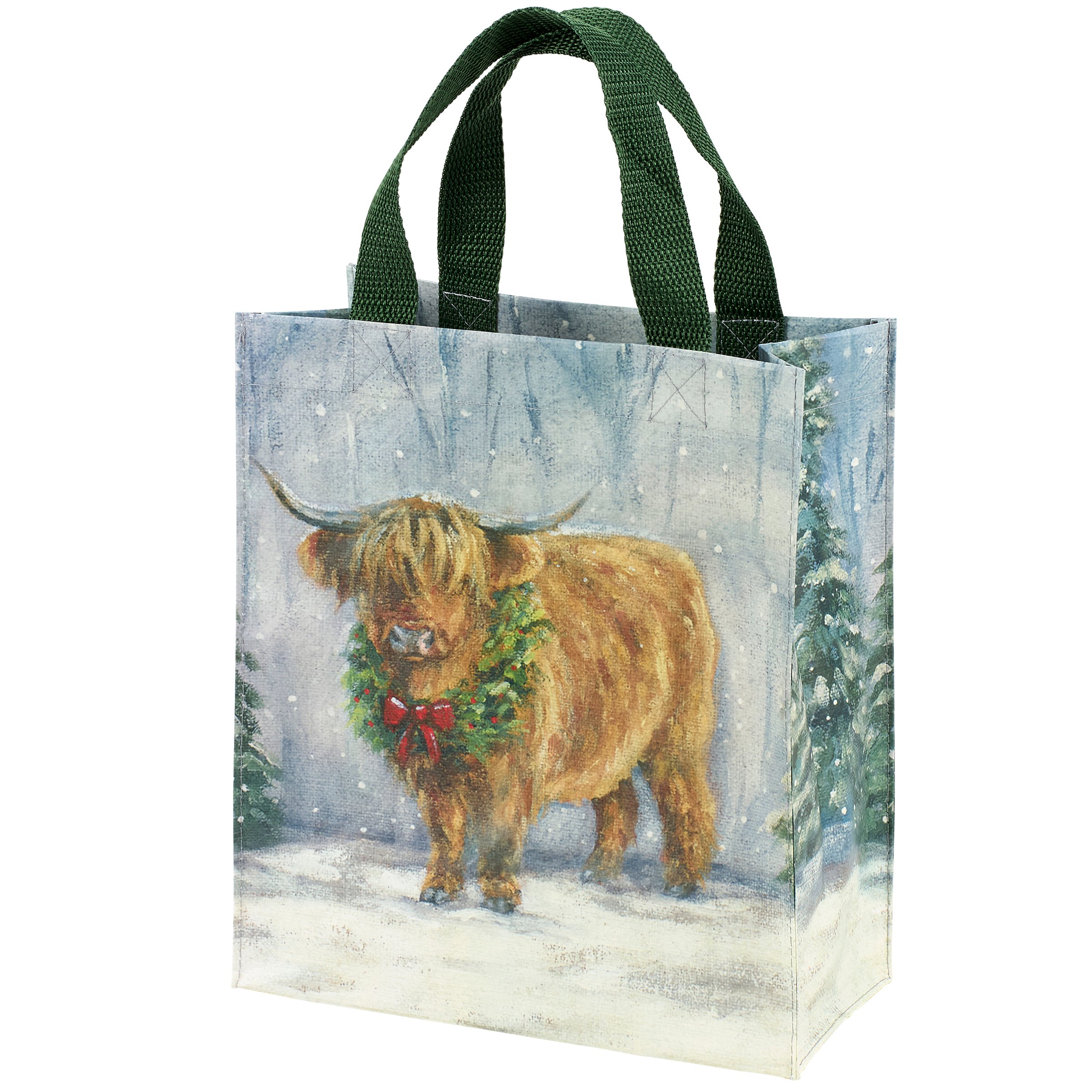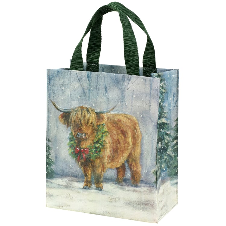A reusable daily tote from our Christmas Collection featuring a double-sided design displaying a charming winter scene of a highland cow wearing a holiday wreath. Seasonal tote gussets feature a coordinating winter forest design. Christmas highland cow design is replicated from original artwork painted onto burlap canvas, giving the art a unique depth and texture. Our Snowy Highland tote is made from eco-friendly post-consumer material and includes complementing green nylon straps. Christmas tote folds flat for compact storage. A farm themed tote perfect for a seasonal accessory or great for reusable gift wrapping.