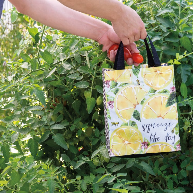 Made of post-consumer material, this double-sided daily tote features watercolor lemon designs and hand lettered "Squeeze The Day" sentiment. Gusset features black and white plaid pattern for added interest. Bag includes complementing nylon straps.
