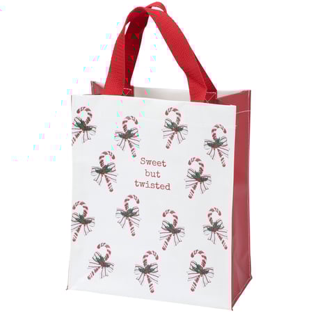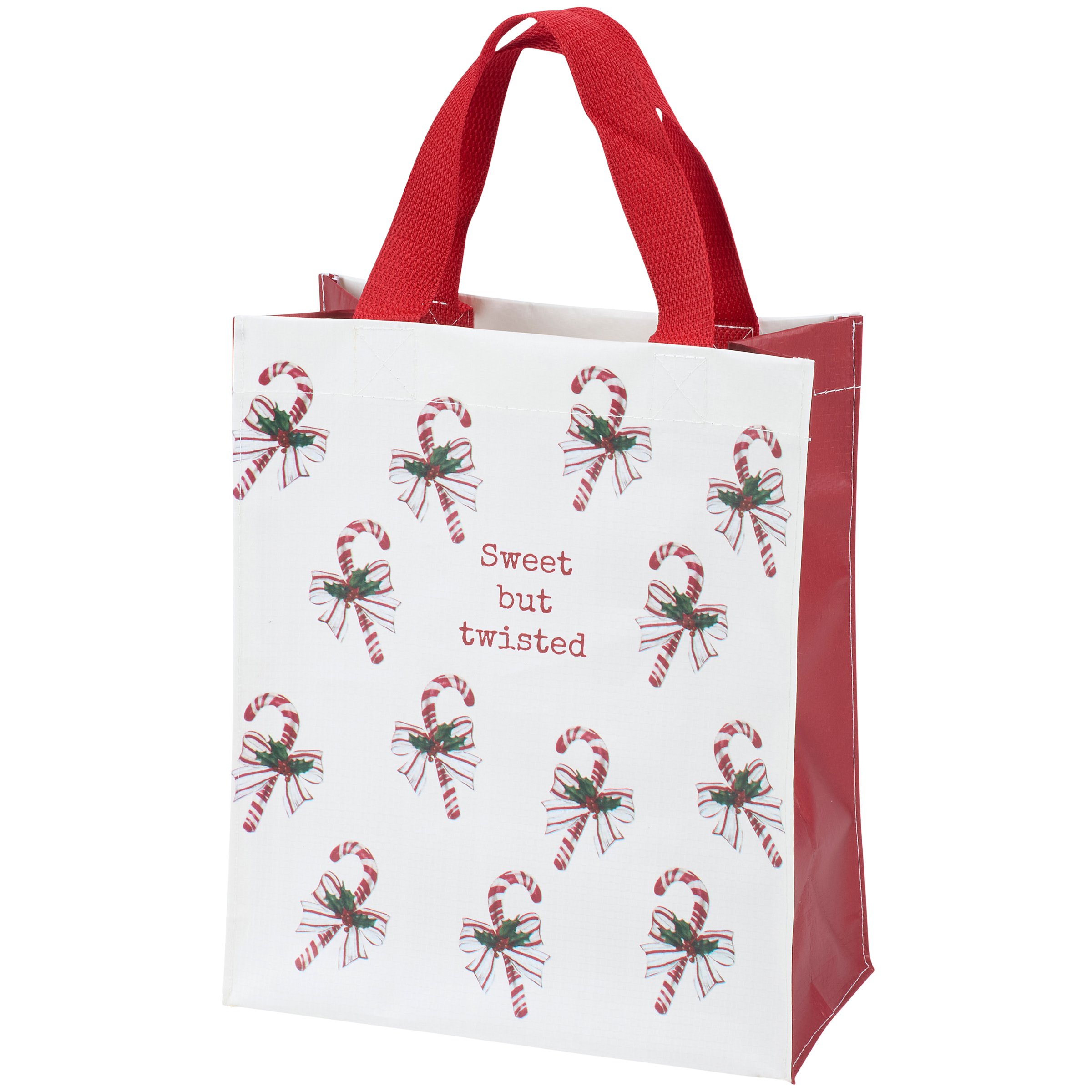 A reusable daily tote from our Christmas Collection featuring a double-sided design displaying a pattern of vintage candy cane art with a fun seasonal pun that reads "Sweet But Twisted." Seasonal tote gussets feature a coordinating red color. Our Sweet But Twisted tote is made from eco-friendly post-consumer material and includes complementing red nylon straps. Christmas tote folds flat for compact storage. A funny Christmas tote perfect for a seasonal accessory or great for reusable gift wrapping.