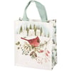 A double-sided daily tote from our Christmas Collection displaying a scene of a cardinal on a winter branch replicated from original artwork hand painted in a delicate watercolor style. Gussets feature a coordinating pattern of winter trees on snowy hills. Our Winter Cardinal tote bag is made from eco-friendly post-consumer material and includes complementing light green nylon straps. Seasonal tote folds flat for compact storage. A charming winter-themed tote perfect for a seasonal accessory or great for reusable gift wrapping.