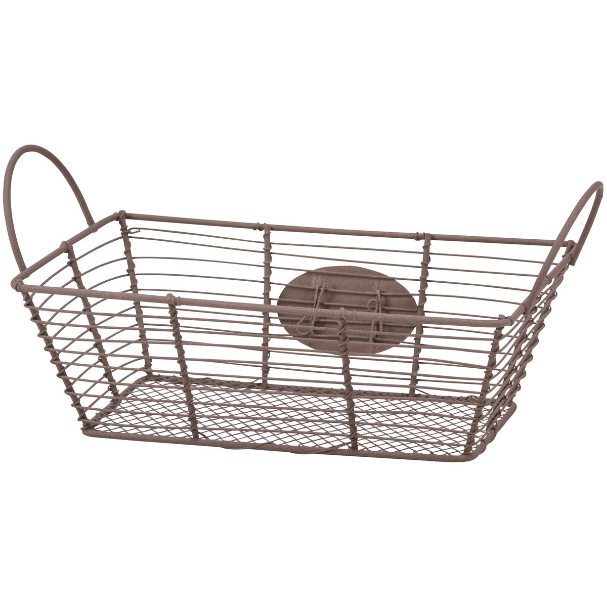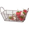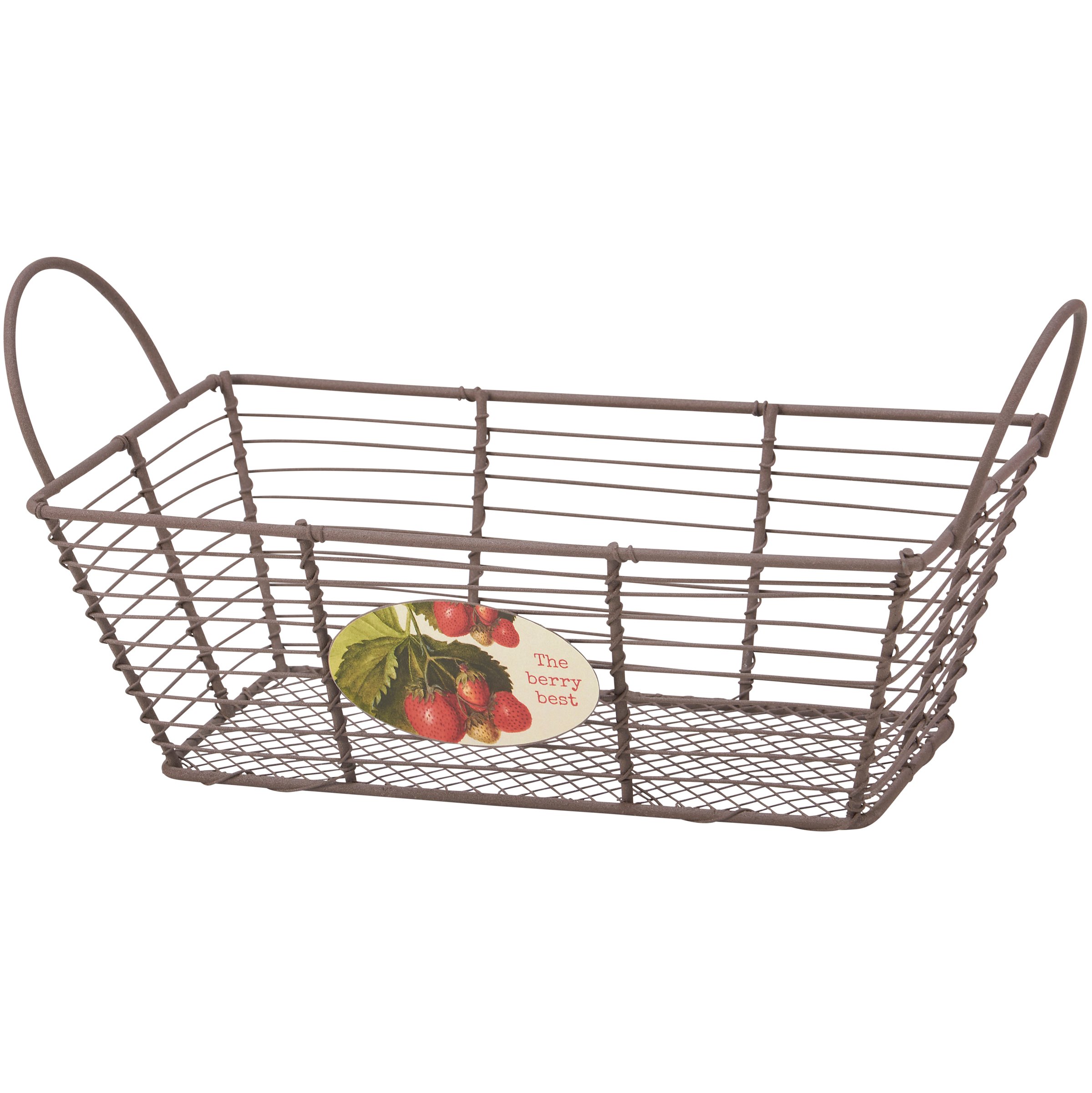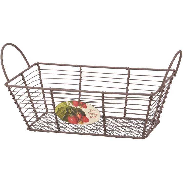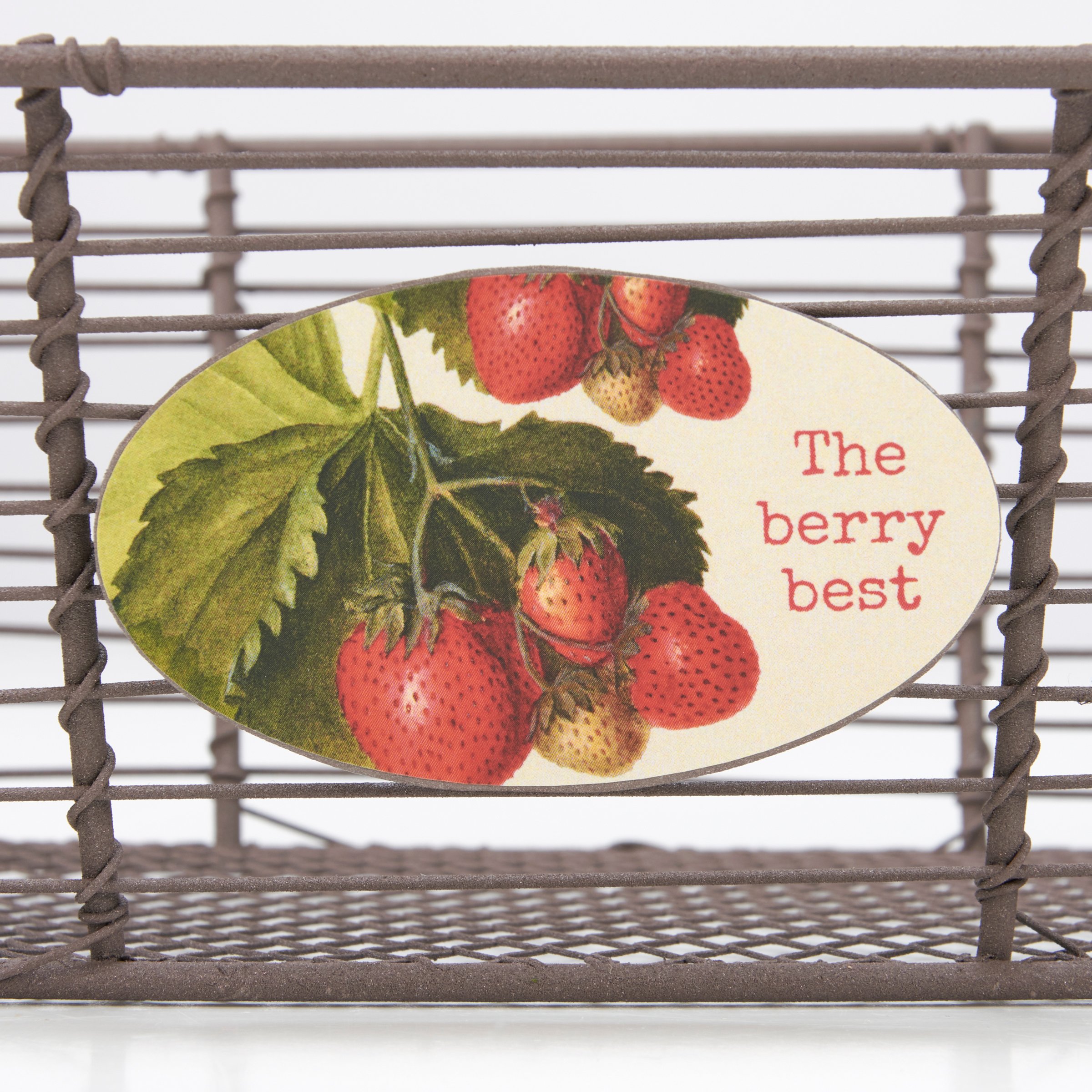 A decorative metal bin from our Garden Collection featuring a rustic wire design with a medallion on the front displaying vintage art of wild strawberries and coordinating punny sentiment that reads "The Berry Best." Décor bin is perfect for storing household items or part of a home décor display. Accessories pictured not included. Our The Berry Best décor bin includes dual metal handles for easy carrying with items inside. A rustic strawberry-themed home accent with a variety of display options.