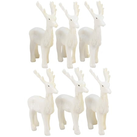 A set of mini decorative deer figurines from our Christmas Collection featuring 6 coordinating white standing stag designs. Deer set is packaged in a box with acrylic lid for easy store display. Our mini Standing Stags deer figurine set is ideal for a vintage seasonal home accent and complements well with other pieces in the collection to create a cohesive display.