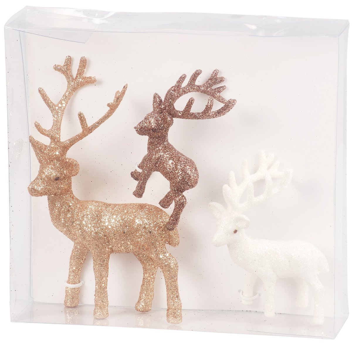 A set of decorative deer figurines from our Christmas Collection featuring 3 different sized stag designs with individual natural color glitter finishes for added style. Our Walking Stags deer figurine set is ideal for a stylish seasonal home accent and complements well with other pieces in the collection to create a cohesive display.