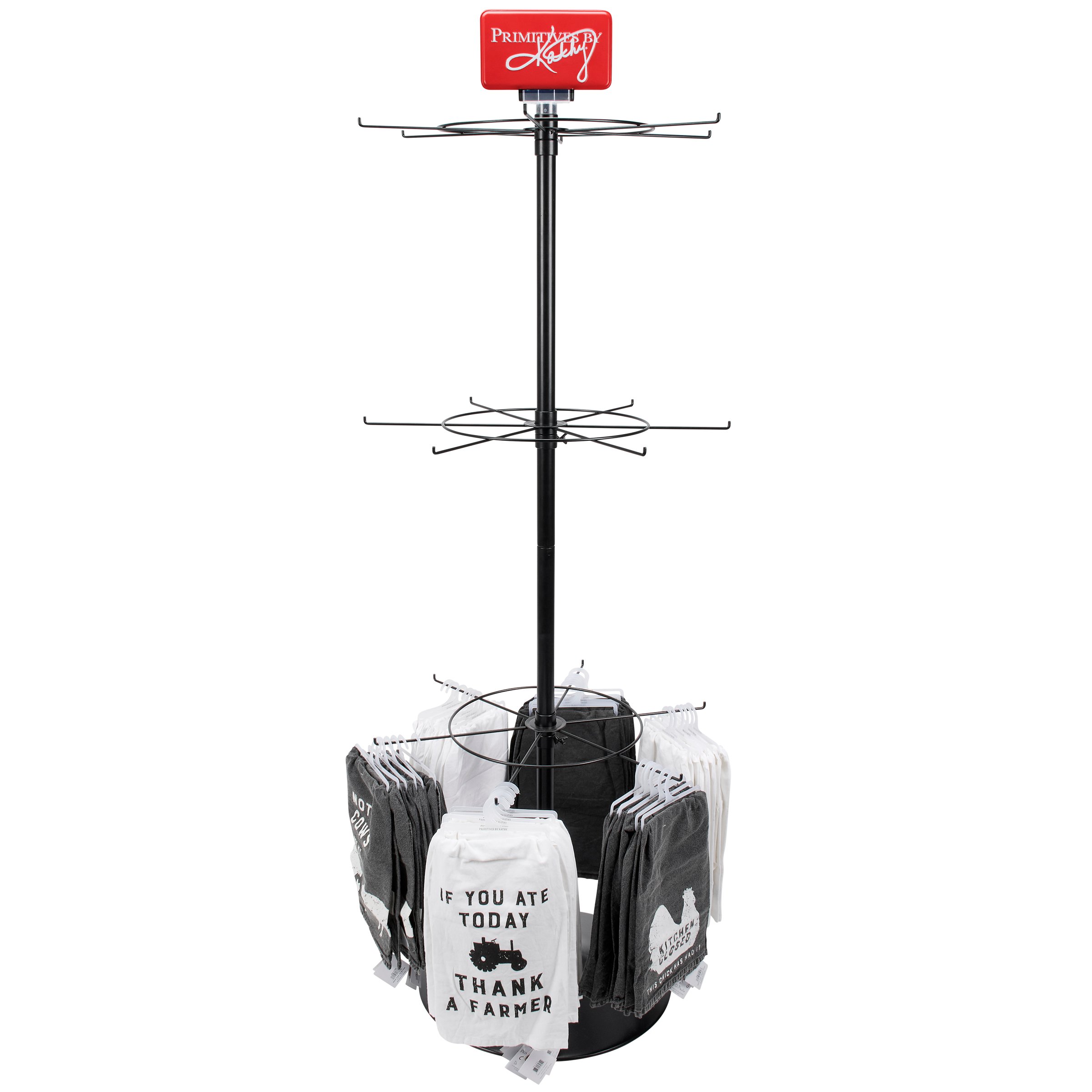 Want to build you own story? Our metal display racks give you more options to improve your customer experience and make the most out of your store space. At just 18 inches of floor space, this Primitives by Kathy kitchen towel store display features a space saving size with easy to shop spinning racks that can showcase up to 18 designs and hold approximately 108 towels in total. Store display rack includes a premium double-sided brand sign with the option to place or remove on the top slot. We also include free product to offset your rack purchase and get your display started. Average retail value of free kitchen towels is $180. A versatile kitchen towel floor rack that helps you save store space and enhance product displays.