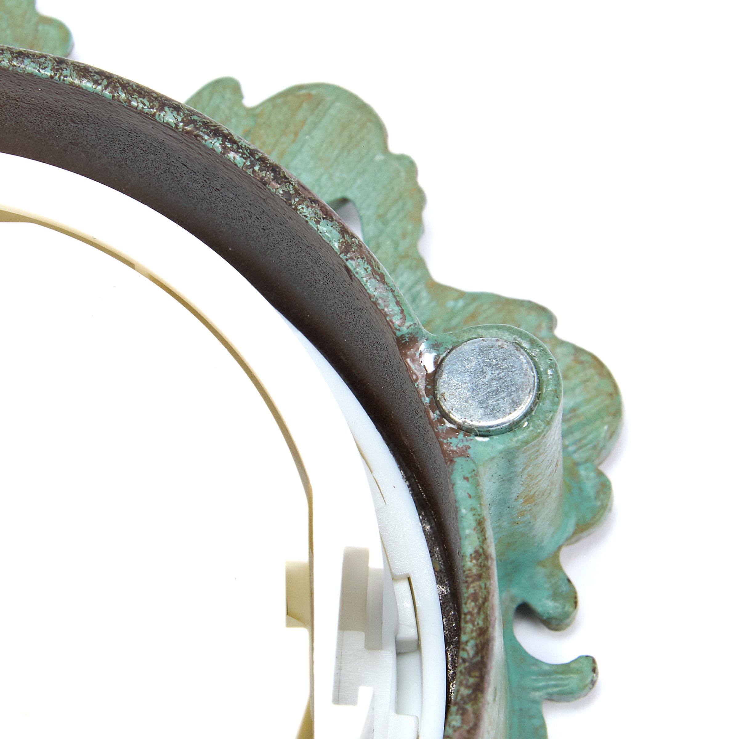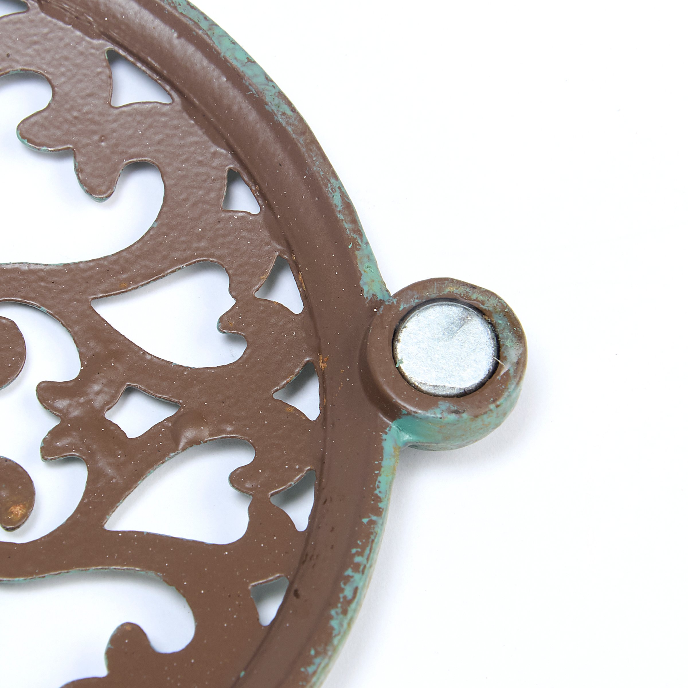 A small desk clock from our Art Nouveau Collection displaying a vintage inspired design with metal filigree frame around the face of the clock. Filigree frame features a patina inspired finish. Clock hands and number elements feature complementing vintage style. Our Vintage Filigree desk clock is designed to free stand for display on flat surface. Requires 1 AA battery (not included) that can easily be replaced via the magnetic back cover. A vintage home accent perfect for everyday display.
