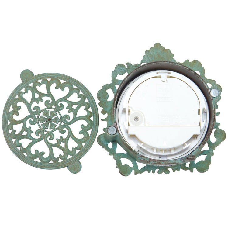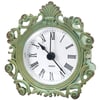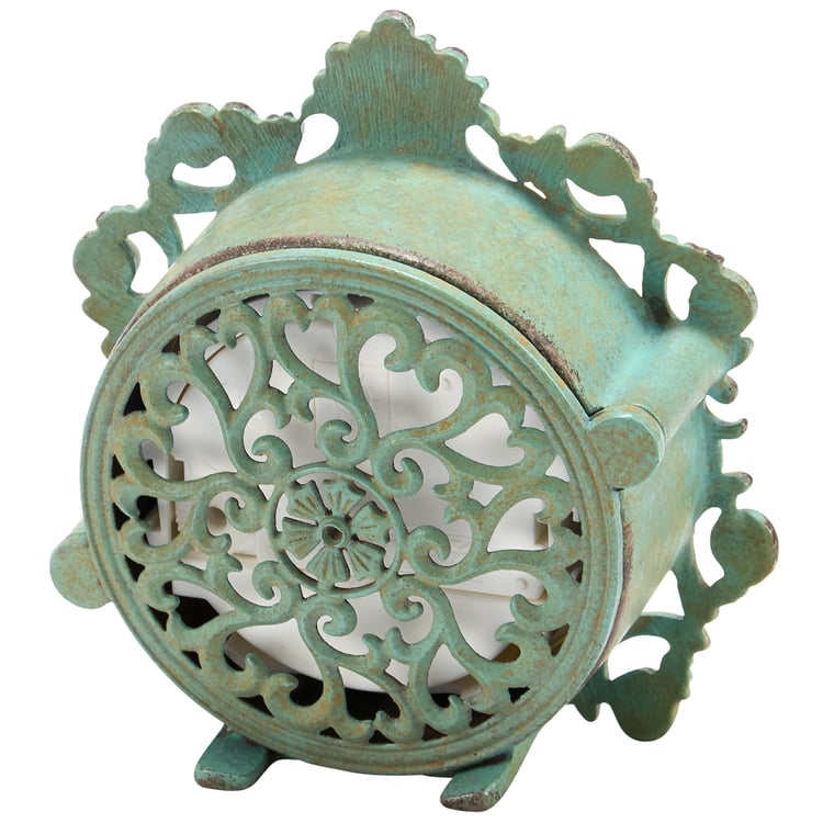 A small desk clock from our Art Nouveau Collection displaying a vintage inspired design with metal filigree frame around the face of the clock. Filigree frame features a patina inspired finish. Clock hands and number elements feature complementing vintage style. Our Vintage Filigree desk clock is designed to free stand for display on flat surface. Requires 1 AA battery (not included) that can easily be replaced via the magnetic back cover. A vintage home accent perfect for everyday display.