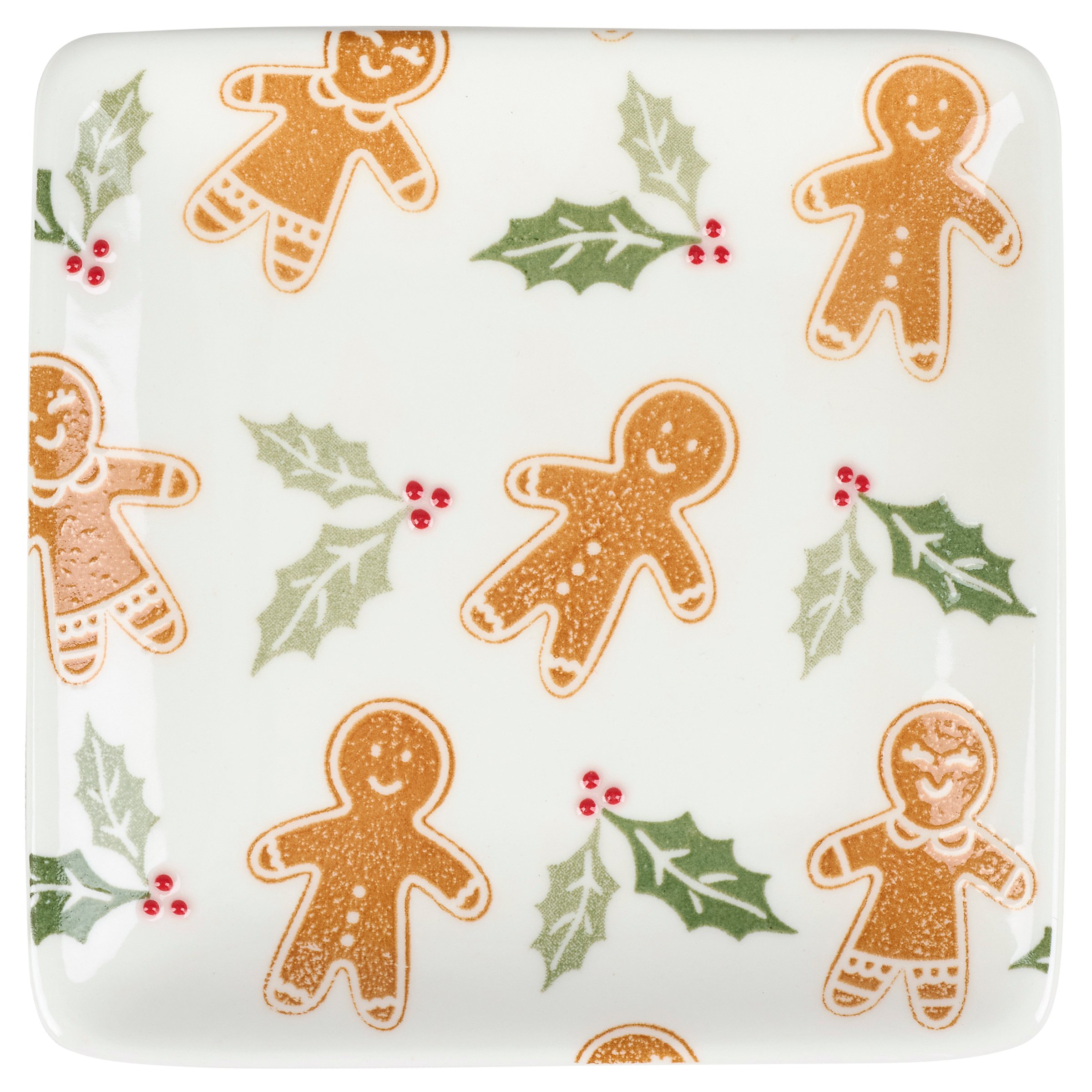 A durable ceramic dessert plate from our Christmas Collection featuring a gingerbread man and holly pattern on the serving area of the plate. Our Gingerbread dessert plate is conveniently microwave, oven, dishwasher, and food safe for easy use. A piece of seasonal dishware perfect for gingerbread themed tablescapes.
