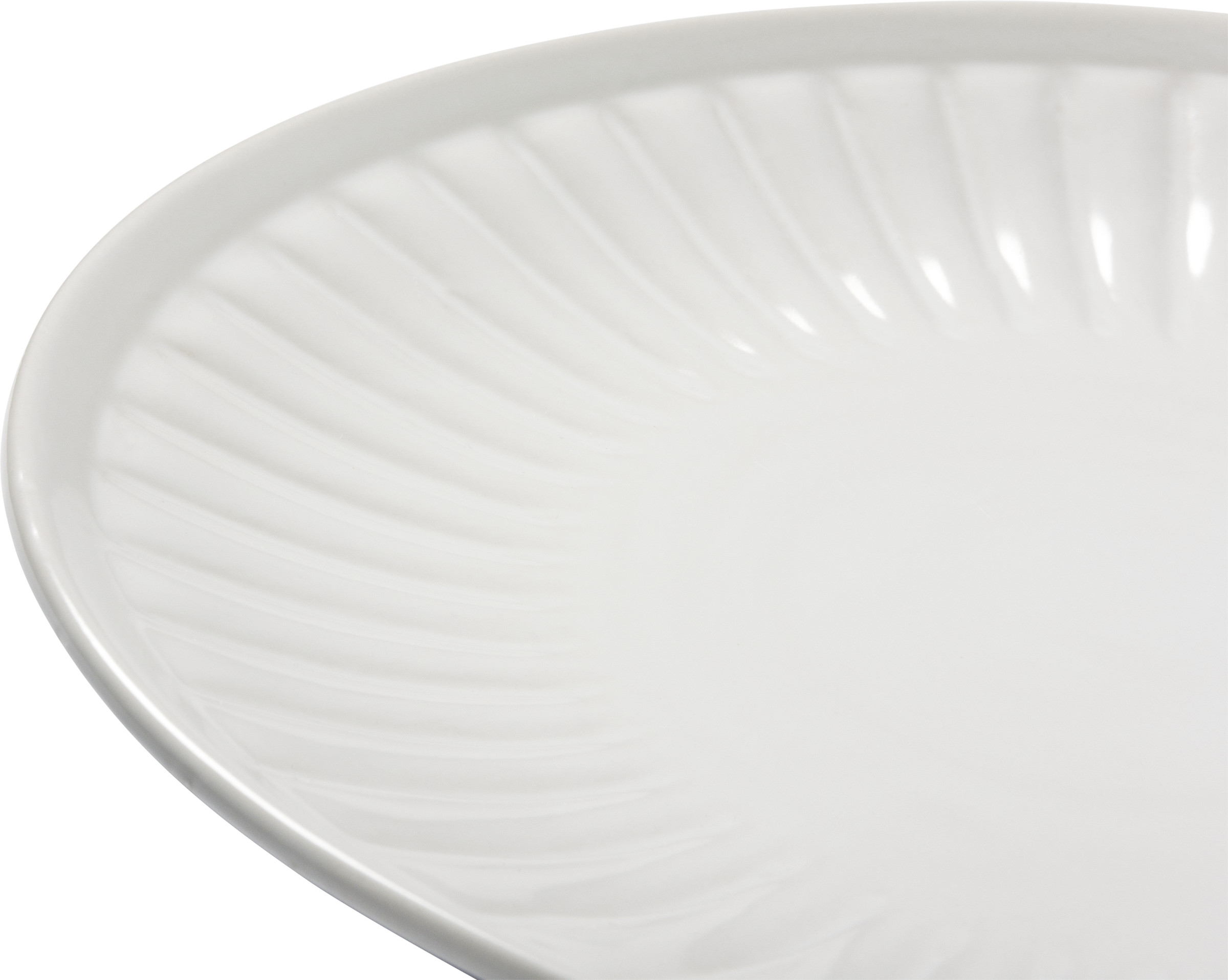 A white stoneware fluted dinner plate from our Tabletop Collection featuring ribbed texture to add interest. Microwave, oven, dishwasher and food safe. This item makes a perfect addition to a farmhouse aesthetic and coordinates well with other pieces in collection!