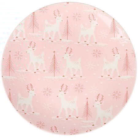 A durable ceramic dinner plate from our Christmas Collection featuring a holiday pink pastel color with debossed patterns of reindeer, snowflakes, and Christmas trees on the serving area of the plate. Our Pink Reindeer dinner plate is conveniently microwave, oven, dishwasher, and food safe for easy use. A piece of seasonal dishware perfect for pastel Christmas tablescapes.