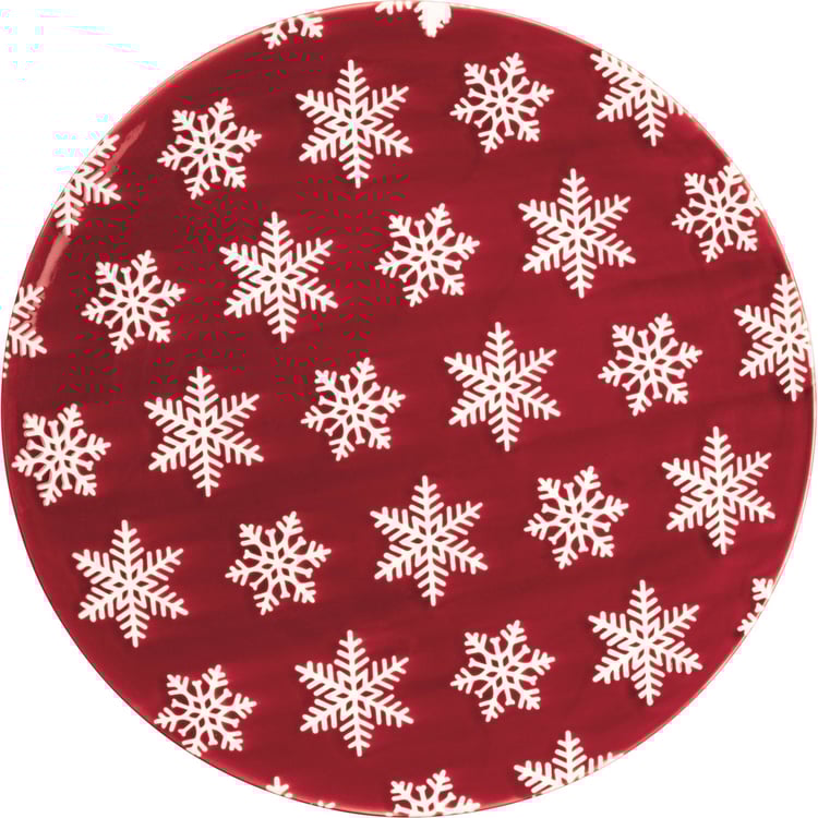 A large red stoneware plate featuring snowflake designs. Microwave, dishwasher, and food safe.