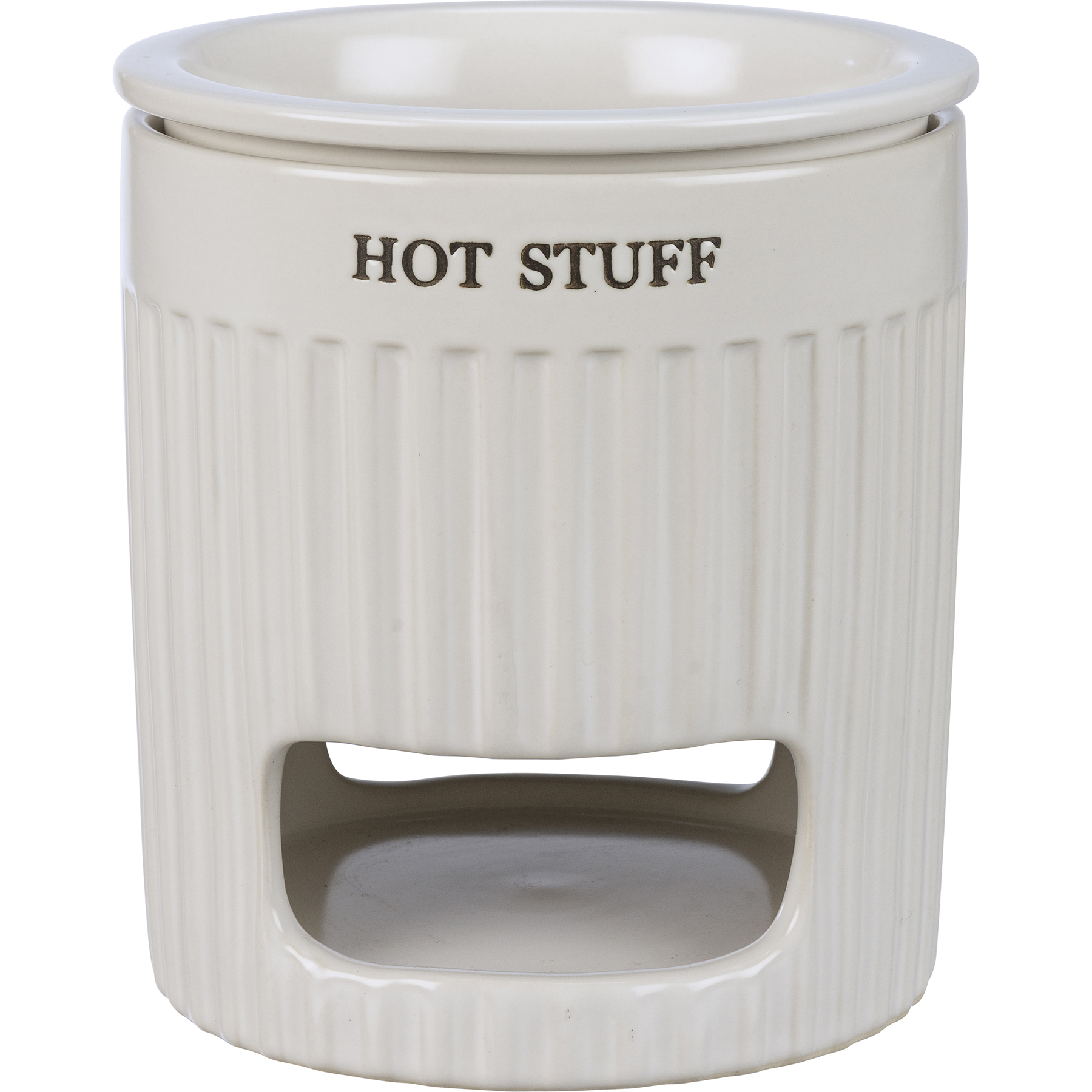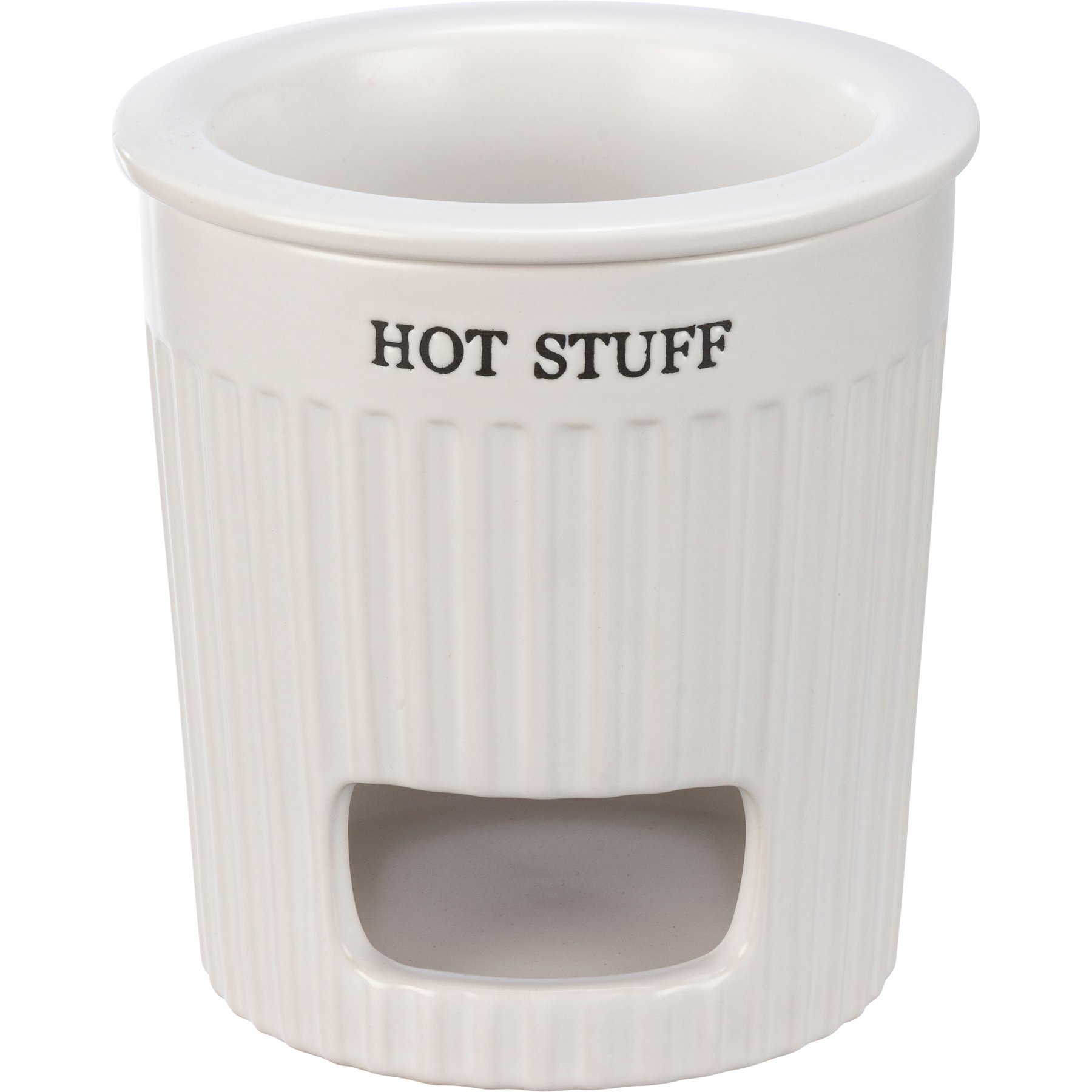 A two-piece stoneware dip warmer lending a "Hot Stuff" sentiment. Base features opening for a tea light, and removable dip dish nests inside top of base to keep dip warm. Set features white color and ribbed base with slate gray text. Microwave, oven, dishwasher, and food safe. This item makes a perfect addition to a farmhouse aesthetic and coordinates well with other pieces in collection!
