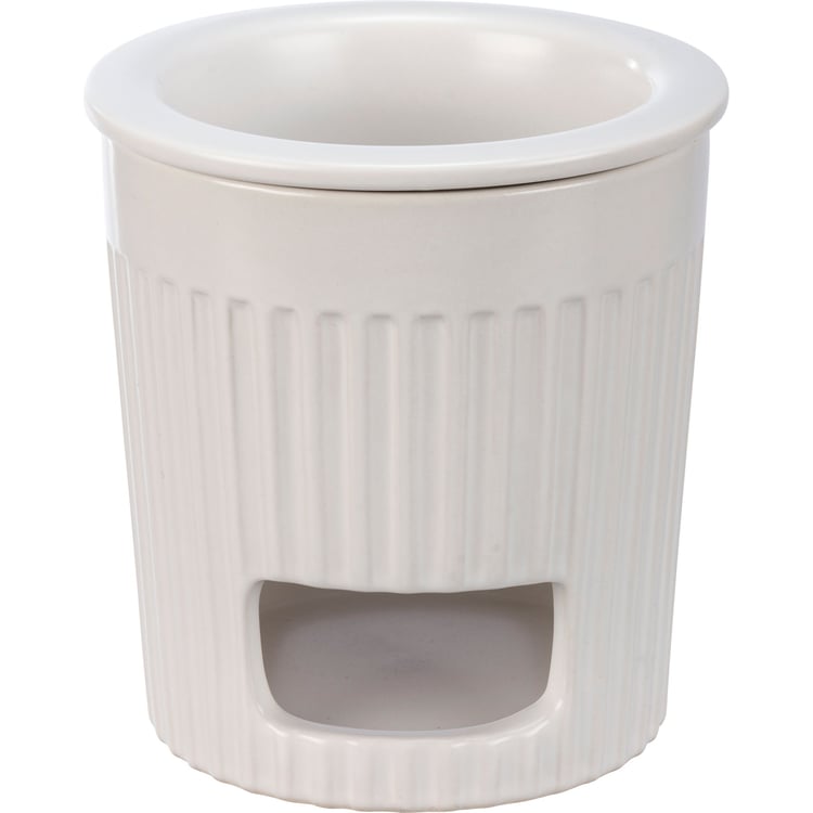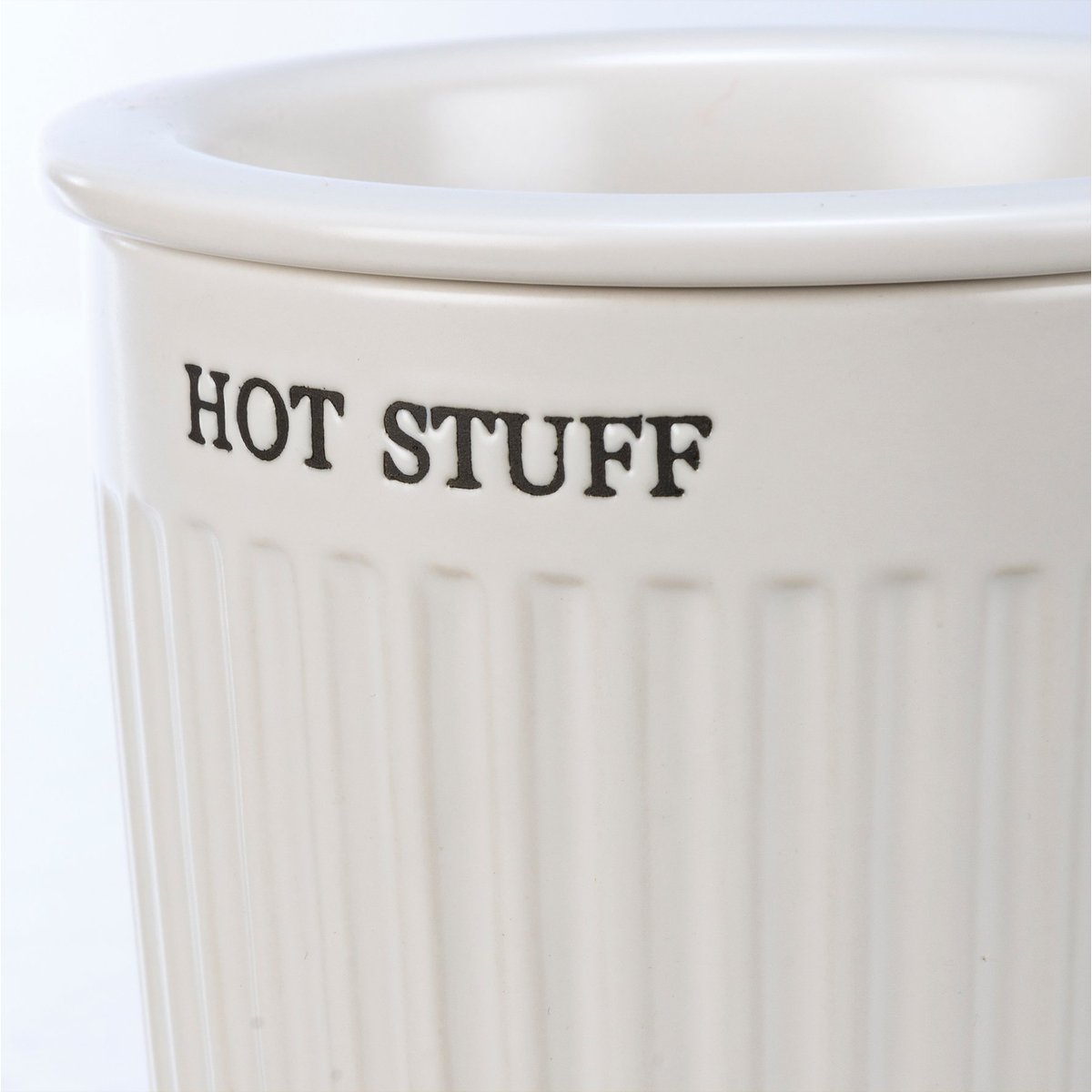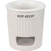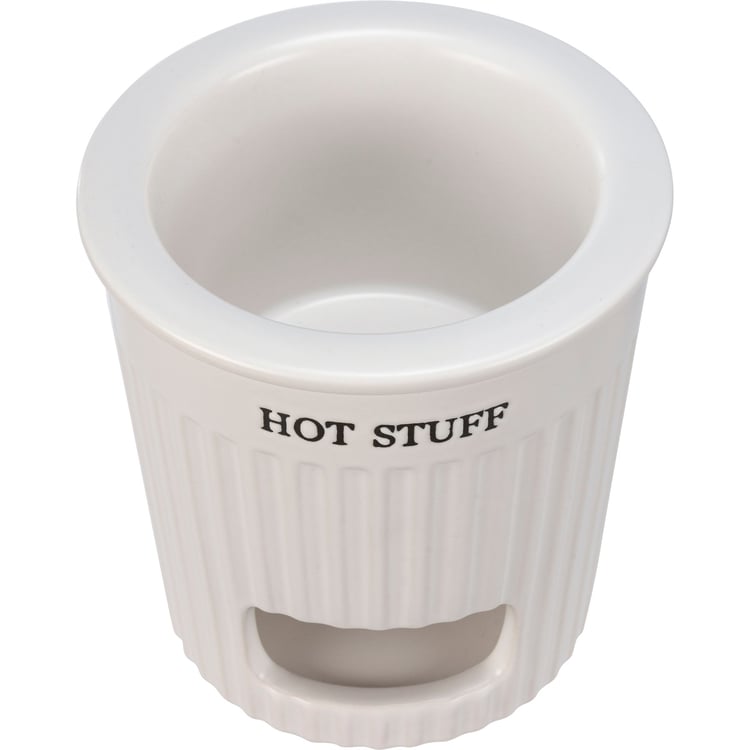 A two-piece stoneware dip warmer lending a "Hot Stuff" sentiment. Base features opening for a tea light, and removable dip dish nests inside top of base to keep dip warm. Set features white color and ribbed base with slate gray text. Microwave, oven, dishwasher, and food safe. This item makes a perfect addition to a farmhouse aesthetic and coordinates well with other pieces in collection!