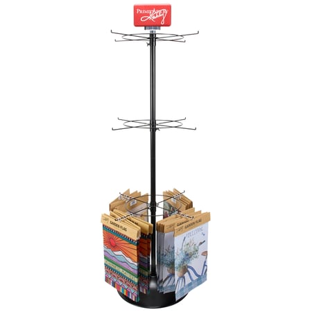 Want to build you own story? Our metal display racks give you more options to improve your customer experience and make the most out of your store space. At just 18 inches of floor space, this Primitives by Kathy garden flag store display features a space saving size with easy to shop spinning racks that can showcase up to 12 designs and hold approximately 72 garden flags in total. Store display rack includes a premium double-sided brand sign with the option to place or remove on the top slot. We also include free product to offset your rack purchase and get your display started. Average retail value of free garden flags is $130. A versatile garden flag floor rack that helps you save store space and enhance product displays. Not eligible for discounting.