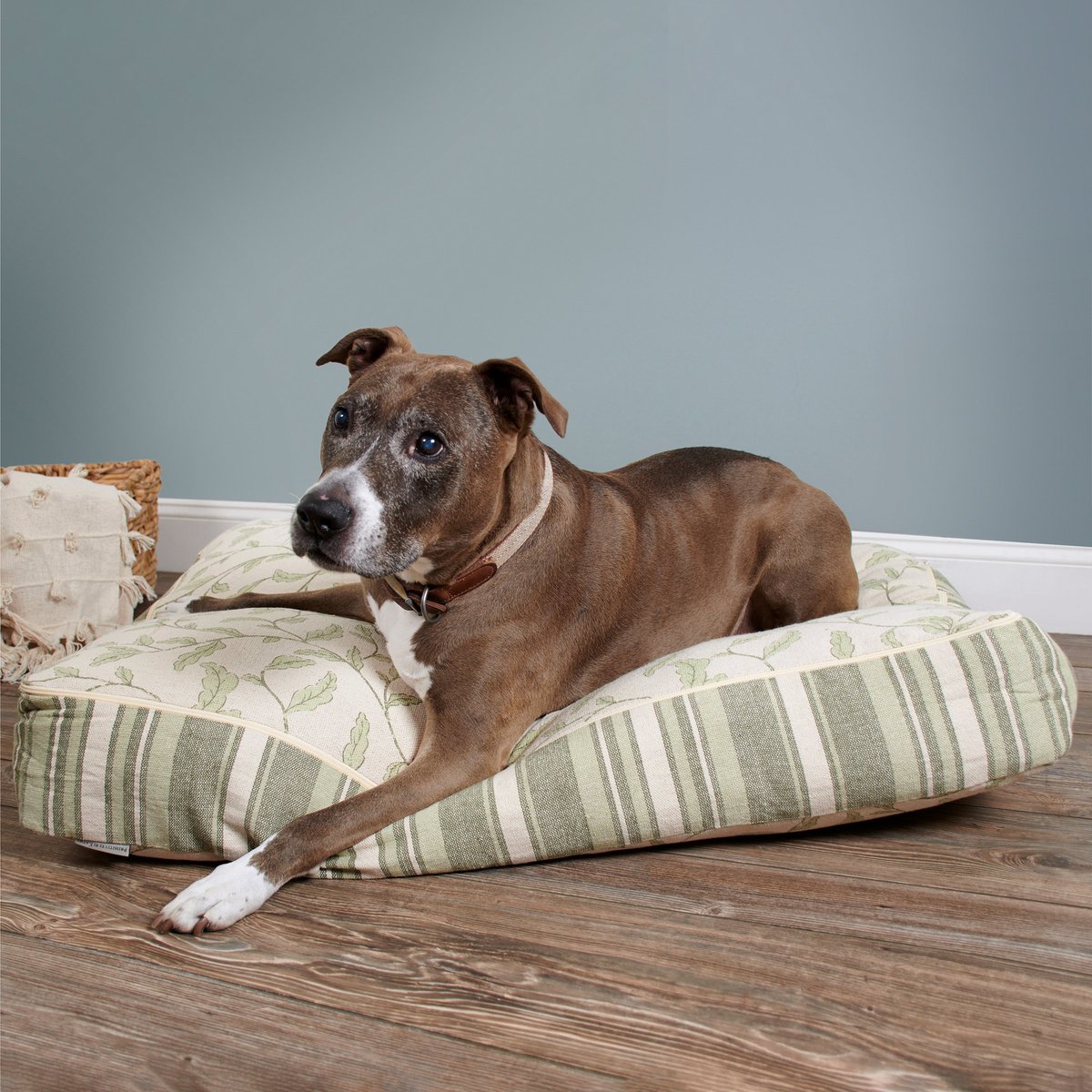 A large cotton dog bed from our Pet Collection displaying a double-sided design of a botanical inspired pattern in a vintage green color palette with a coordinating stripe pattern along the sides. Our X-large Green Botanical dog bed includes a zipper to easily remove and clean the machine-washable cover. Comfy dog bed contains polyester filling and is shipped vacuum-sealed for protection and easy storage. A stylish pet accessory that easily coordinates with home decor adds functional style to any room.