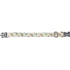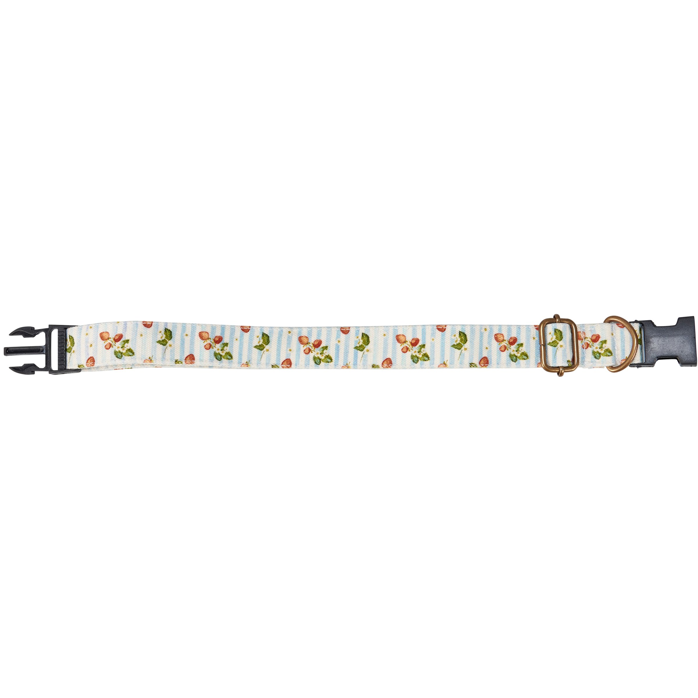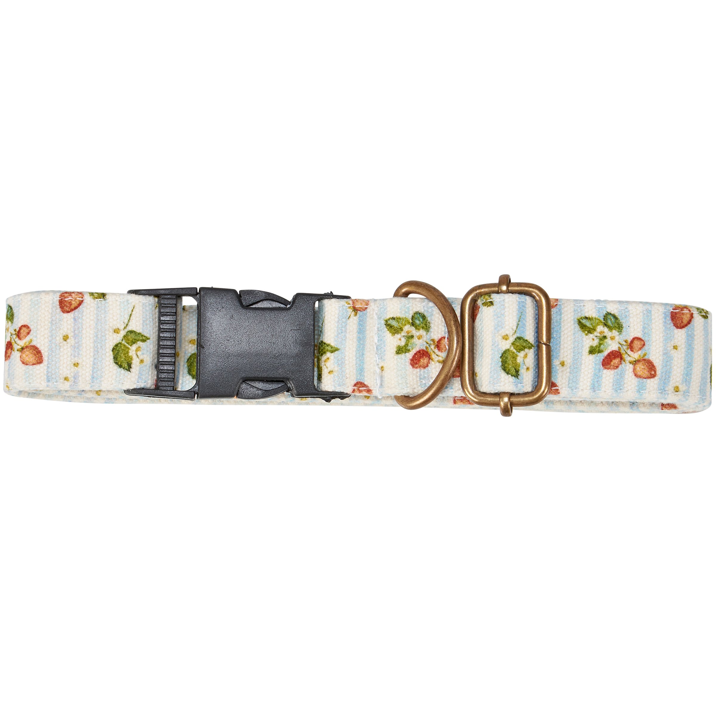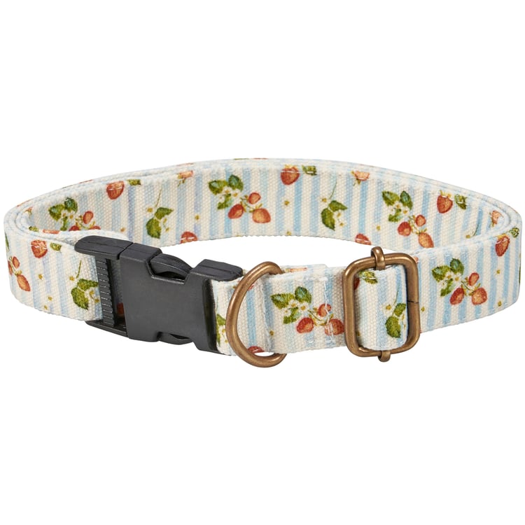 A canvas dog collar from our Pet Collection displaying hand painted designs of strawberries with complementing light stripe pattern. Collar features antique metal hardware for adjusting and attaching leash. Our Strawberries dog collar fits necks from 14 inches to 26 inches. Dog collar is packaged on a cardboard hanger with hole for easy display on rack. A fun strawberry-themed pet accessory perfect for everyday use.