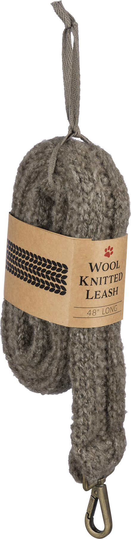 Cozy, durable, and soft, a wool cable knit leash with an antiqued metal clasp for affixing to any collar.