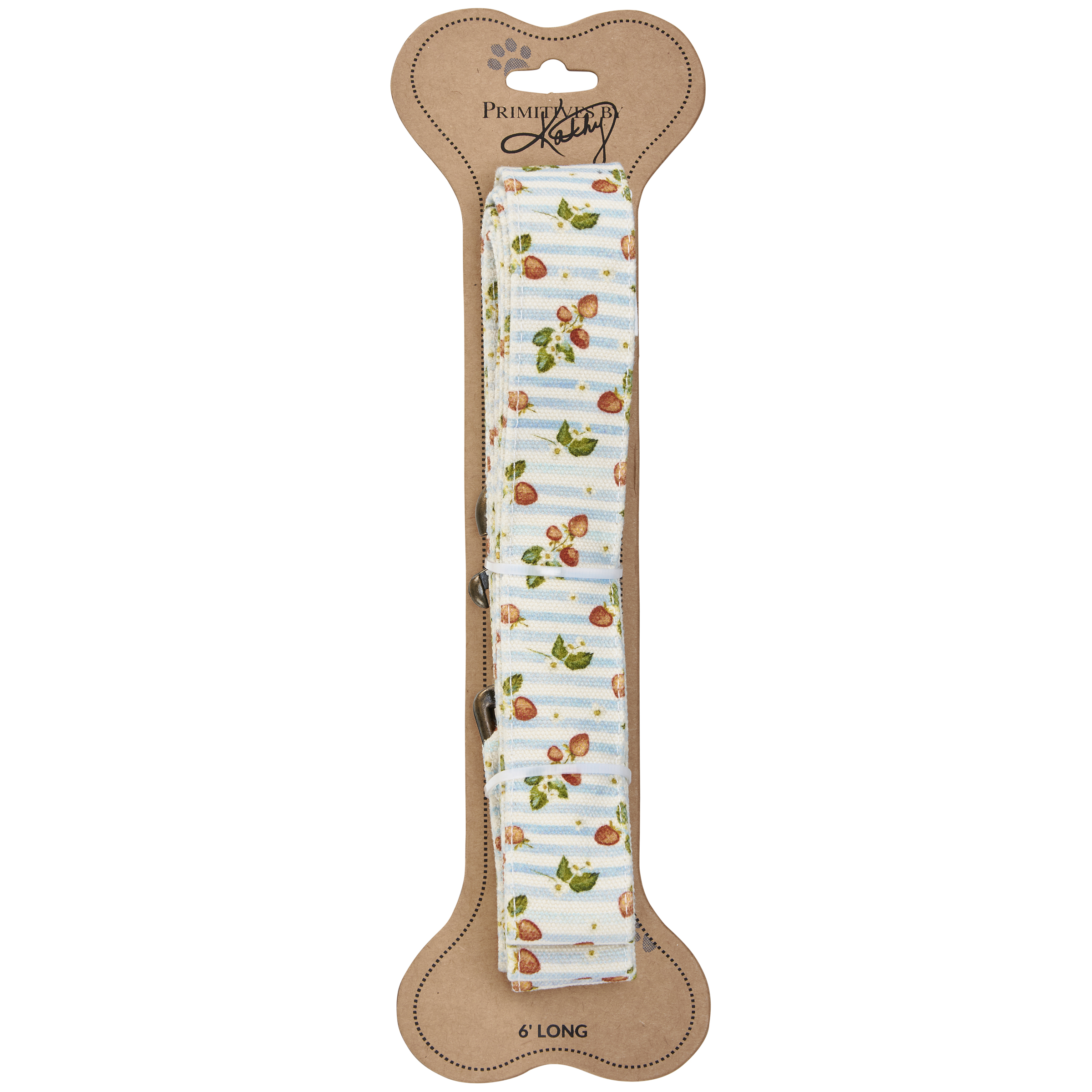 A canvas dog leash from our Pet Collection displaying hand painted designs of strawberries with complementing light stripe pattern. Leash features 72 inches of length and antique metal hardware for attaching leash to collar. Our Strawberries dog leash is packaged on a cardboard hanger with hole for easy display on rack. A fun strawberry-themed pet accessory perfect for everyday use.
